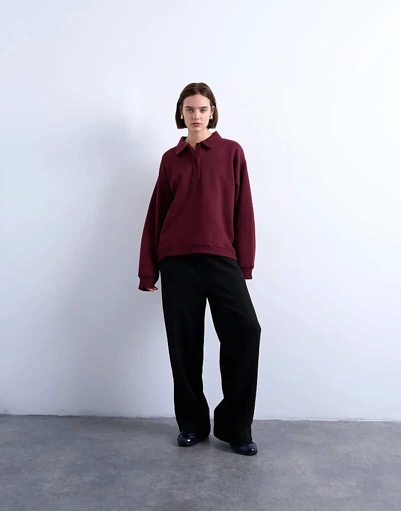 Эта толстовка выполнена из мягкой, тёплой ткани и отличается универсальным однотонным кроем. Она имеет воротник-поло, потайную планку с пуговицами, спущенные плечи, ребристую отделку и свободный крой.