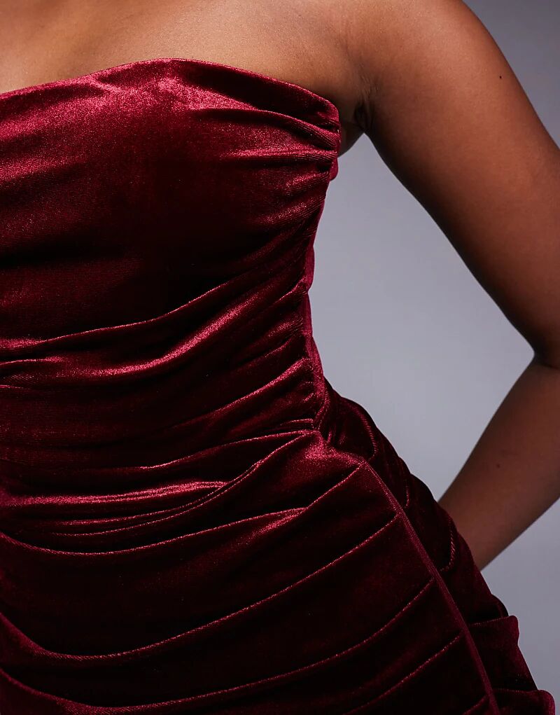 Бордовое бархатное платье-бандо со сборками TFNC