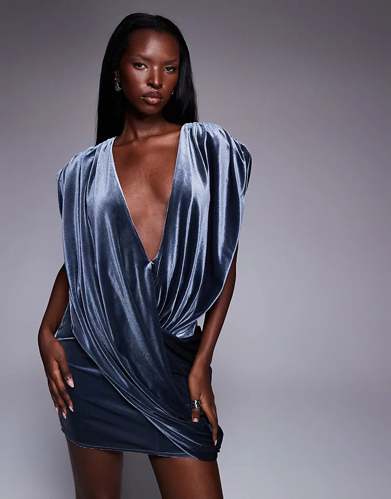 Бархатное мини-платье с драпировкой ASOS DESIGN темно-серого цвета