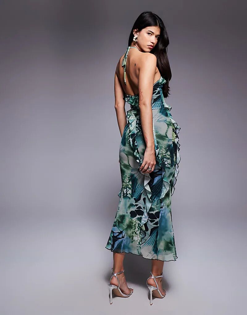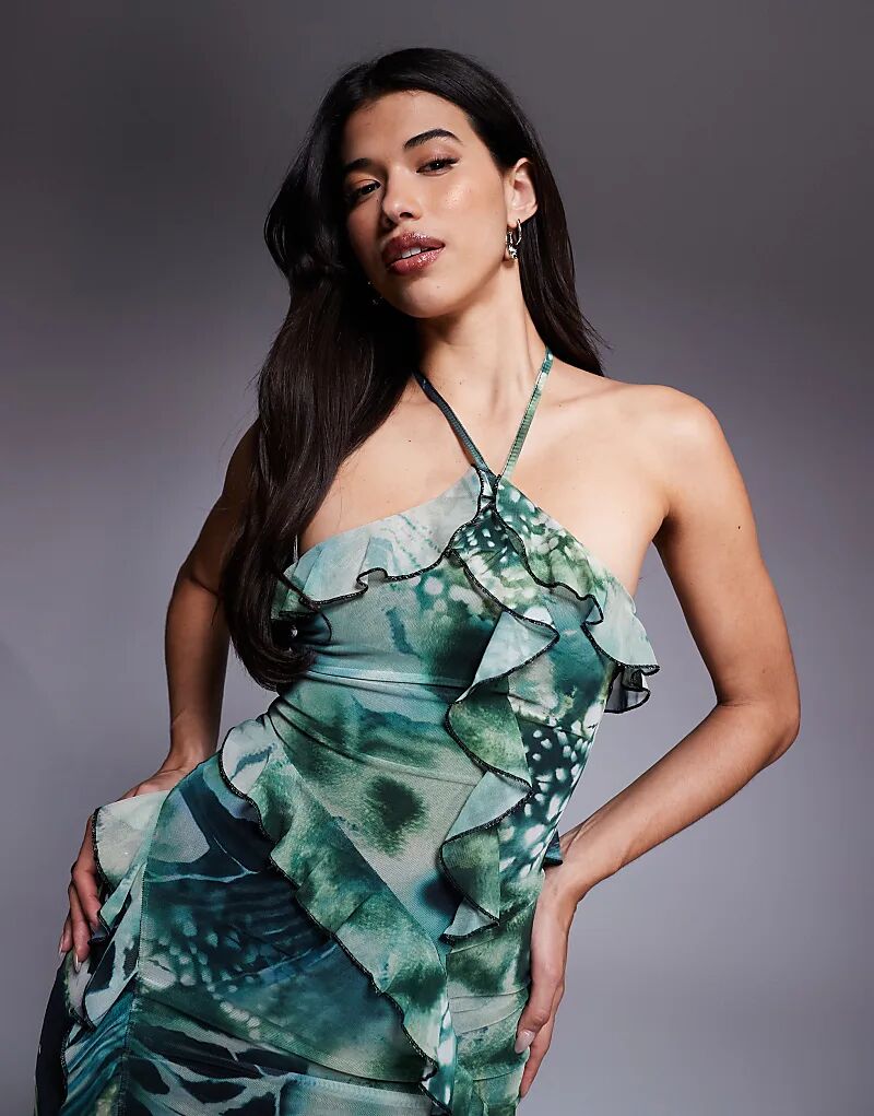 Платье миди ASOS DESIGN с оборками и водопадом на шее из сетки, платье миди с принтом