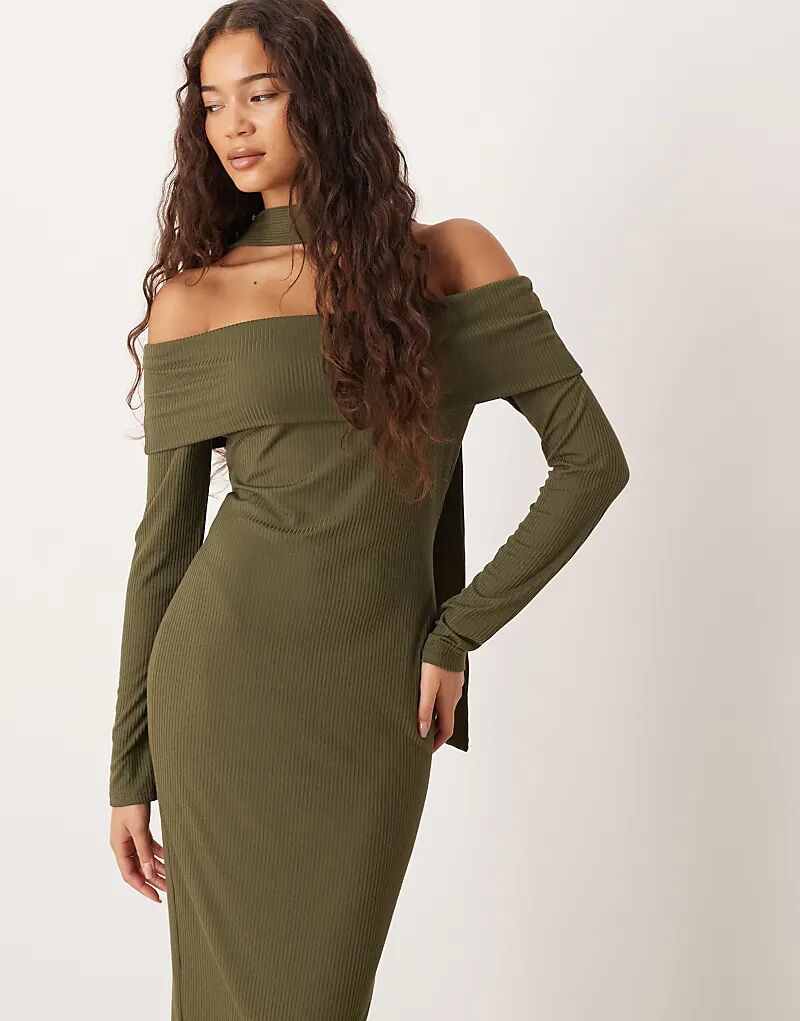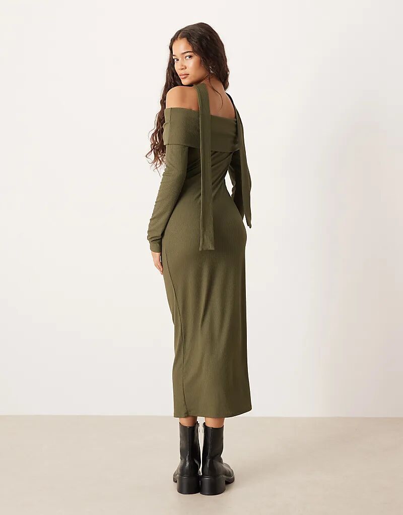 Платье миди ASOS DESIGN в рубчик с лифом-бардо и шарфом цвета хаки