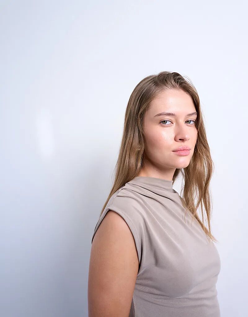 Это платье из мягкого эластичного трикотажа универсального однотонного кроя без рукавов, с высоким воротом, сборками и облегающим кроем.