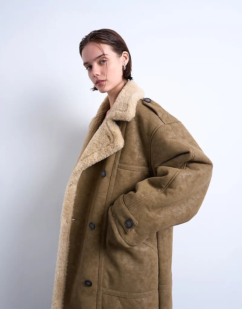 Длинное пальто Topshop из овчины цвета хаки