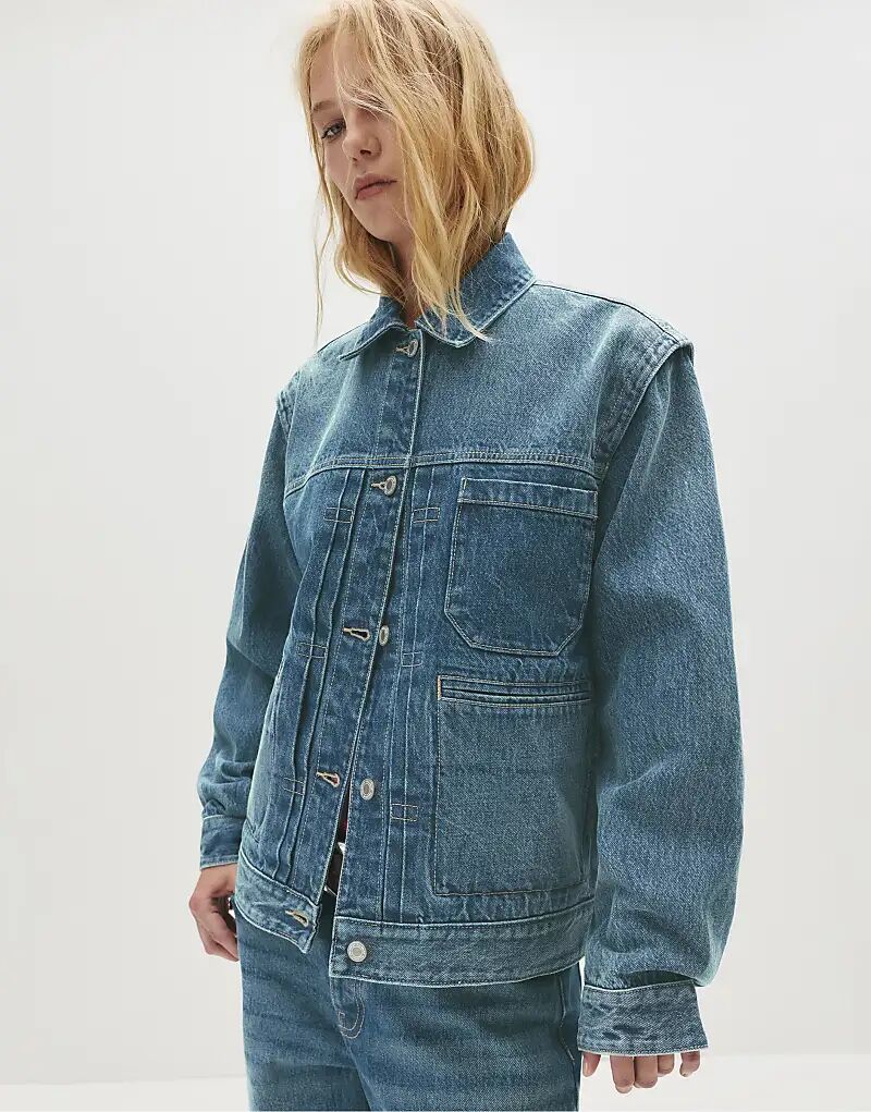 Джинсовая куртка-тракер Pull&Bear с кромкой, средне-синего цвета