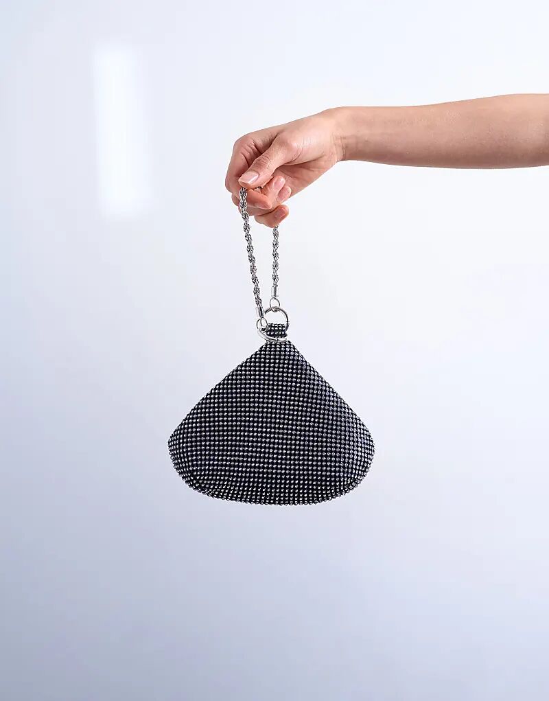 Эта сумка изготовлена ​​из тканого материала, украшенного сеткой со стразами. Ремешок – витая цепочка, магнитная застёжка и застёжка-молния.