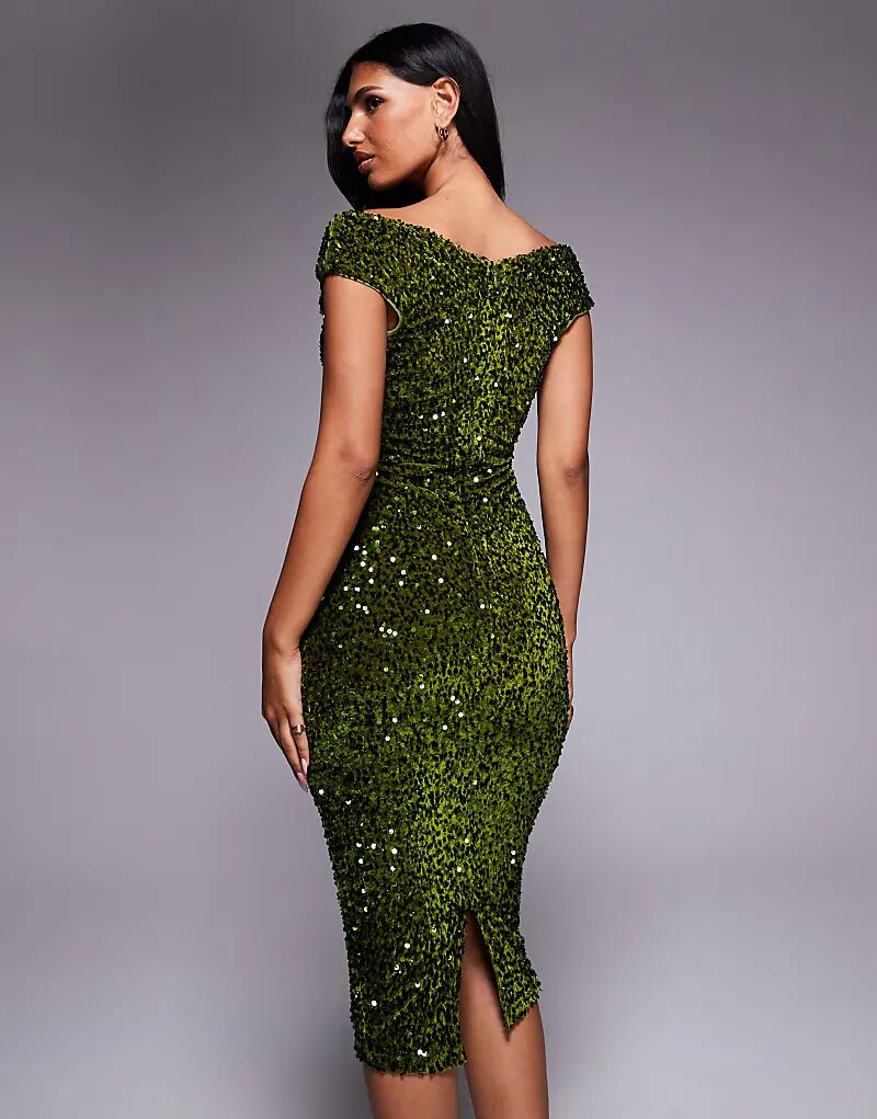 Платье миди Goddiva с пайетками и бархатом в оливковом цвете