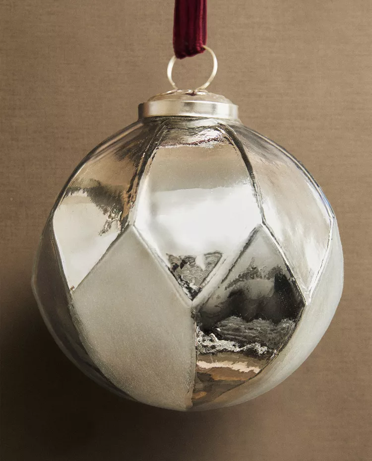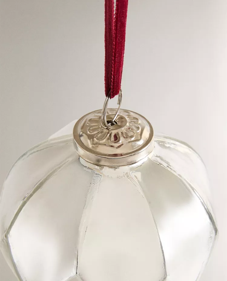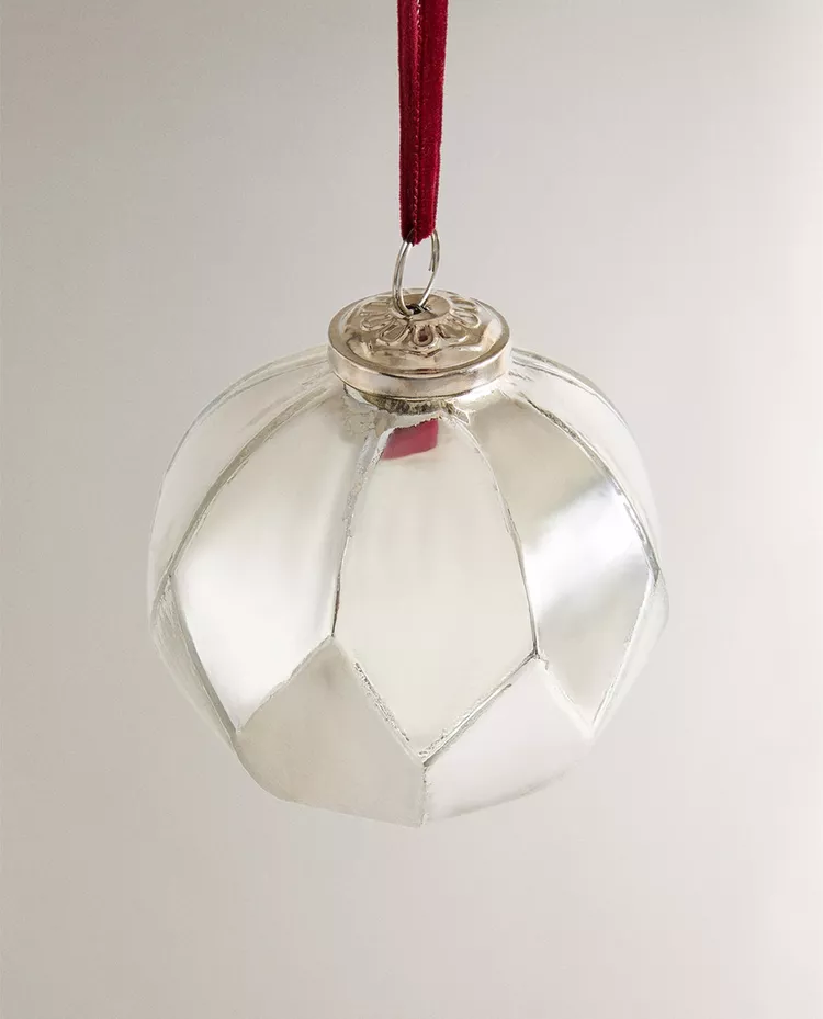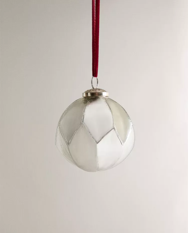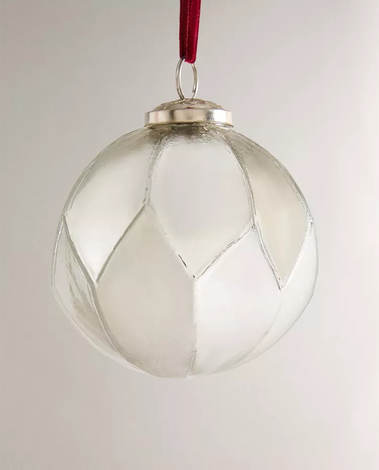 Стеклянное ёлочное украшение в форме шара с ромбовидным узором. В комплекте бархатная лента для подвешивания.