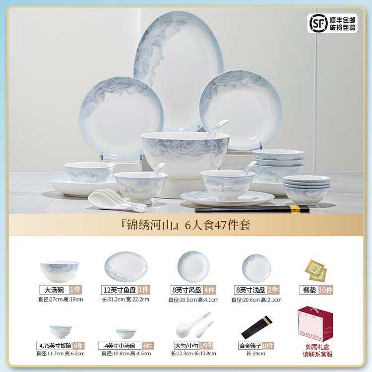 Yichen Jingdezhen набор посуды 72 предмета, фарфор, узор "реки и горы", белый/синий
