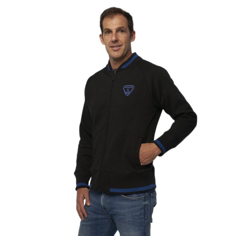Куртка Killian из хлопково-полиэстерового флиса черного цвета с некоторыми аксессуарами и украшениями синего цвета на воротнике, манжетах и внизу.