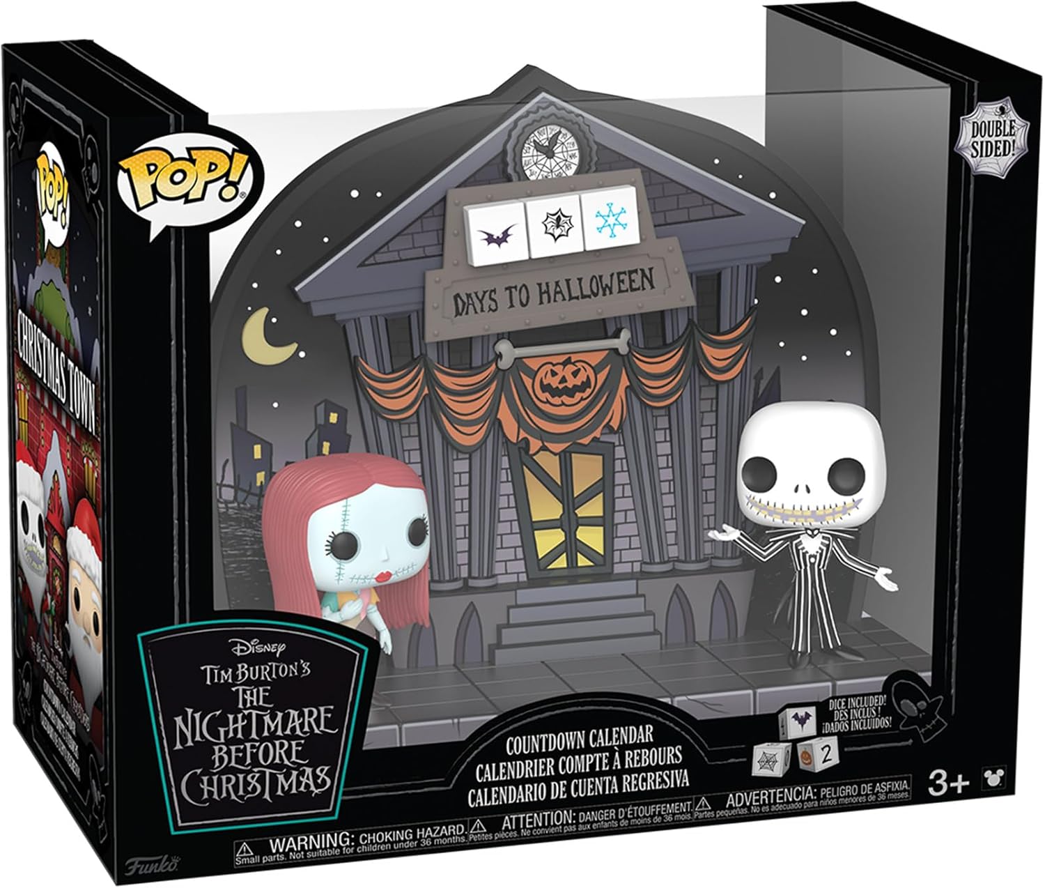 Прогуляйтесь в Хэллоуинский город и поприветствуйте Папу! Салли и Поп! Джек Скеллингтон, стоящий перед Ратушей и её культовыми часами обратного отсчёта. Переверните календарь обратного отсчёта, чтобы найти Поп! Санта-Джек и Поп! Сэнди Клоуз на фоне собственного обратного отсчёта Рождественского города!