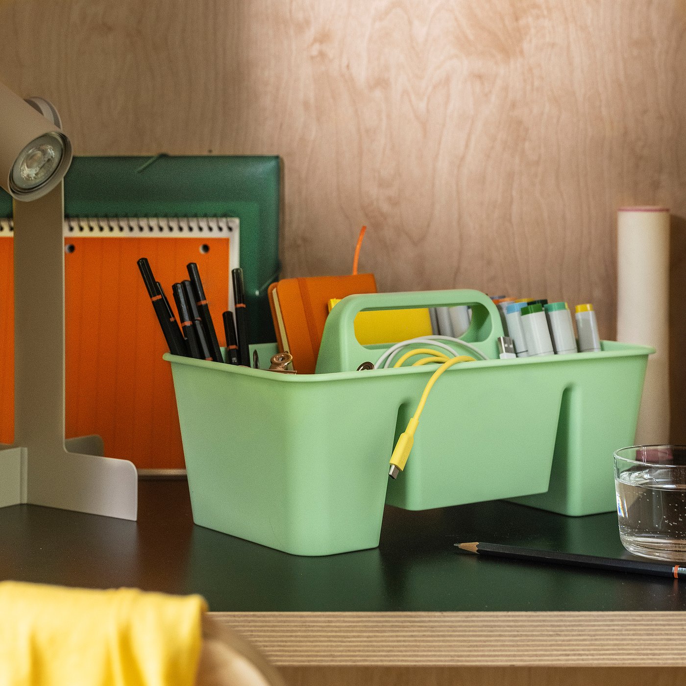Благодаря прочной ручке этот настольный органайзер легко переносить, когда вы хотите сменить рабочее место.