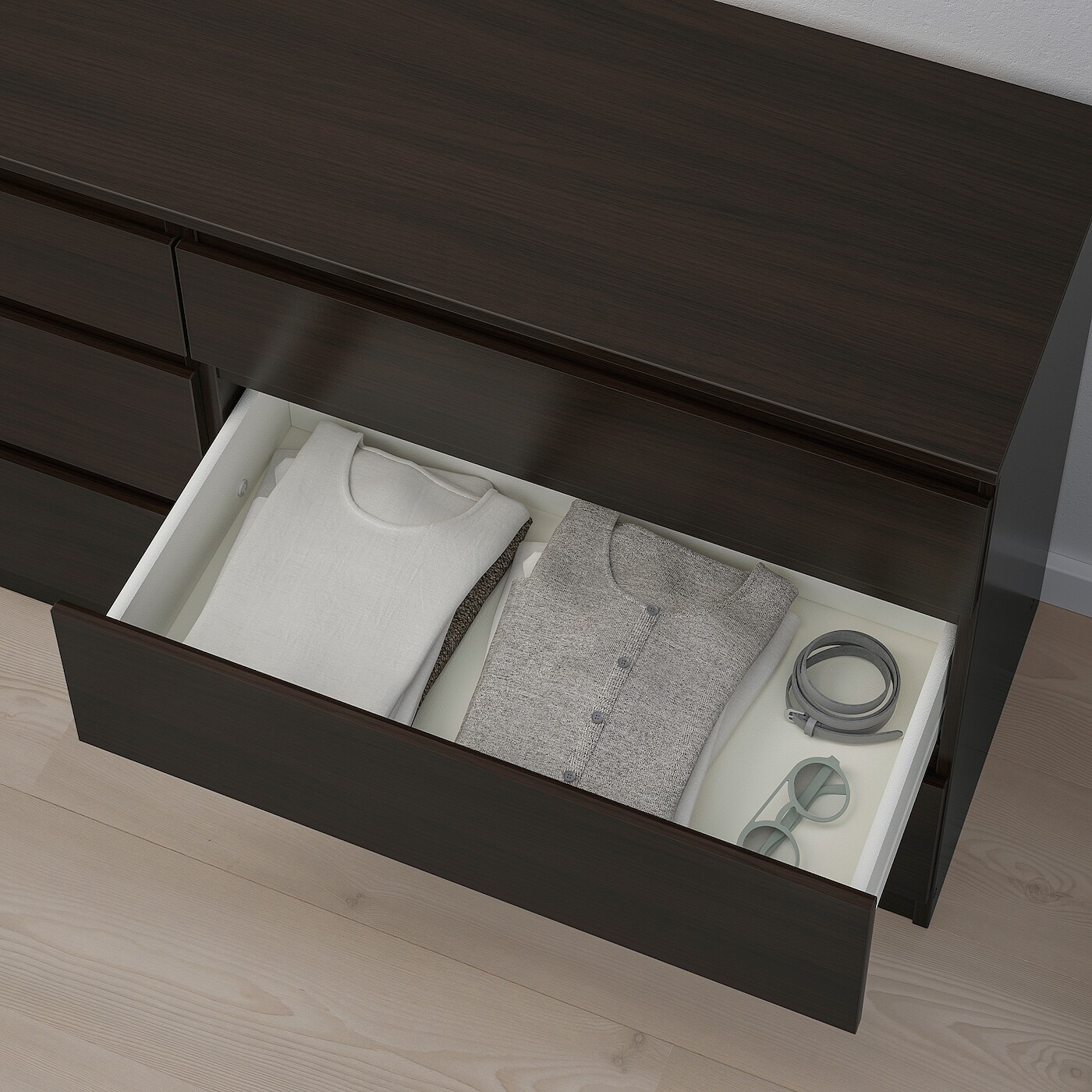 В большом ящике поместятся примерно 8 пар сложенных брюк или 16 футболок.