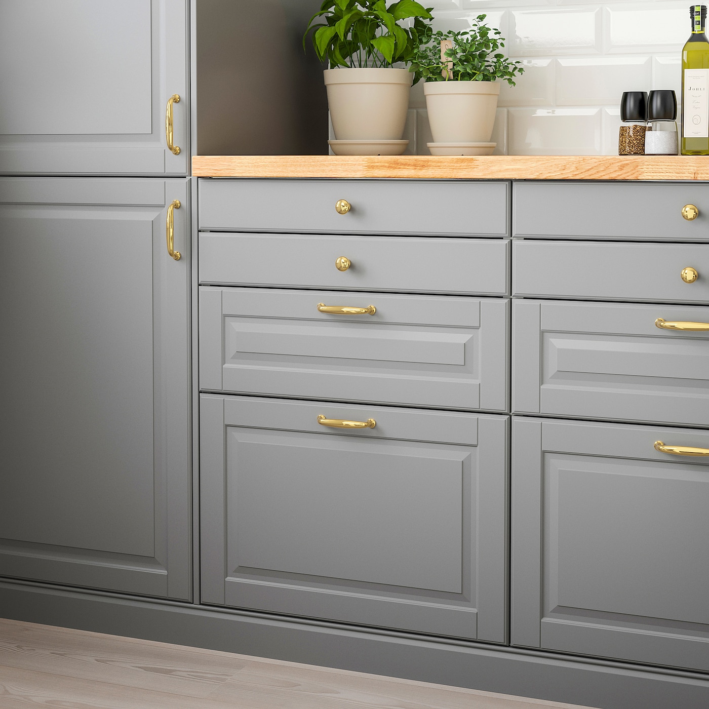 Дверца BODBYN имеет раму и скошенную панель, которые придают ей неповторимый, традиционный характер. Мягкий серый цвет добавит изысканности вашей кухне.
