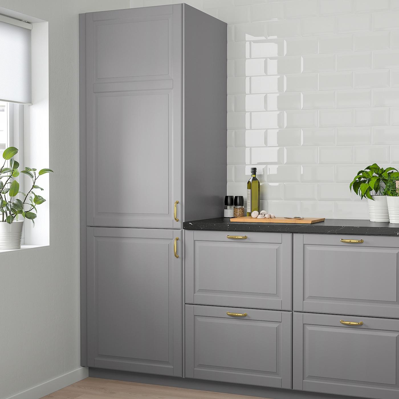 Дверца BODBYN имеет раму и скошенную панель, которые придают ей особый, традиционный характер. Мягкий серый цвет добавит изысканности вашей кухне.