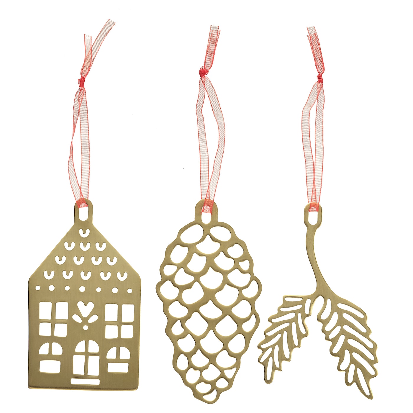 Веточка с листьями, шишка и домик — всё это сделано из тяжёлого золотистого металла. Они красиво мерцают, медленно покачиваясь на ветвях ёлки.