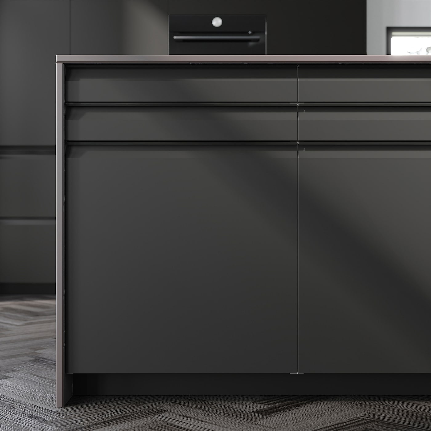 Встроенная алюминиевая ручка черного цвета гармонично сочетается с фасадом, создавая современный и графичный вид. Она также обеспечивает устойчивость и удобный, естественный захват.
