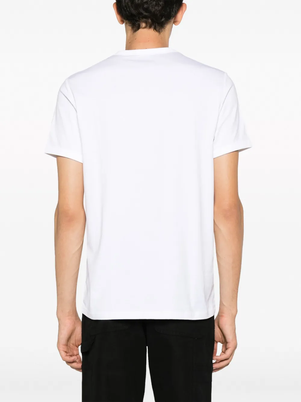 Вышитый логотип на груди, круглый вырез, короткие рукава и прямой подол.