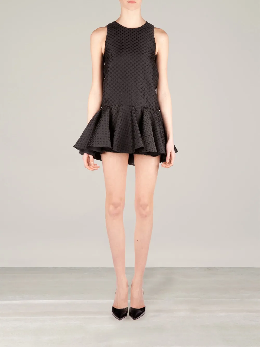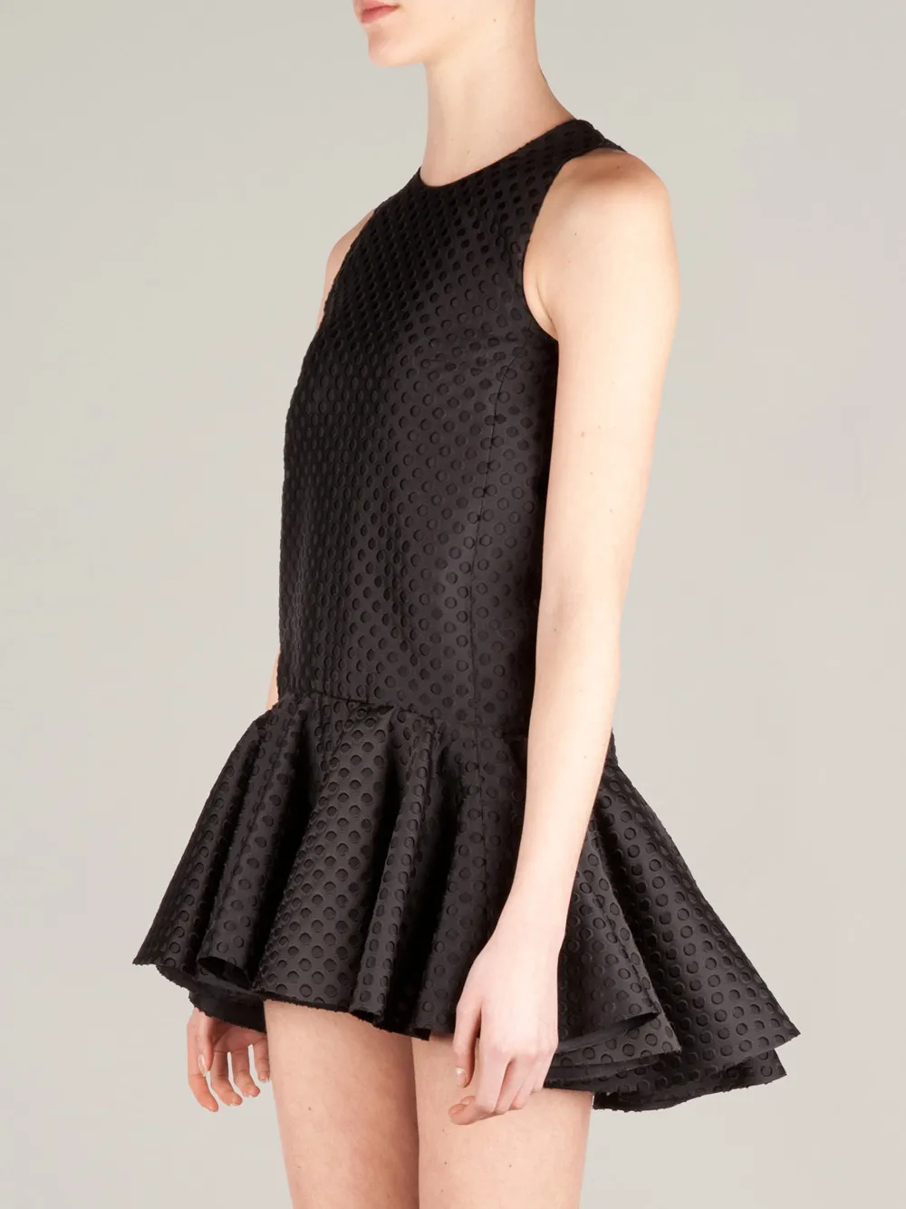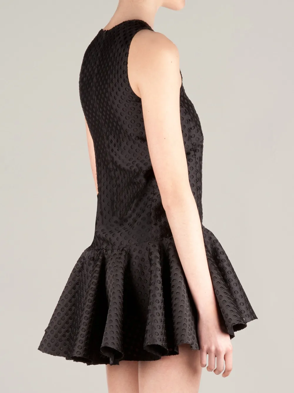 Чёрное перфорированное платье из шёлкового микса от Giambattista Valli, круглый вырез, дизайн без рукавов, перфорированная деталь, расклешённая юбка, застёжка на молнии сзади