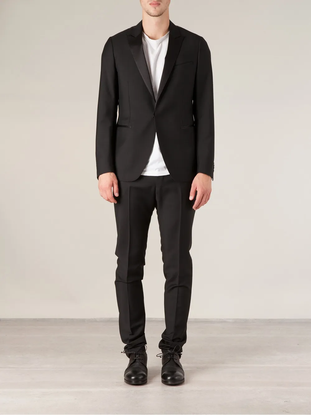 Чёрный классический костюм из шерстяного с мохеровым микса от L"éclaireur, заострённые лацканы, нагрудный карман, застёжка на пуговицах спереди, два передних кармана, длинные рукава, манжеты на пуговицах, пояс с петлями для ремня, потайная застёжка спереди, боковые карманы