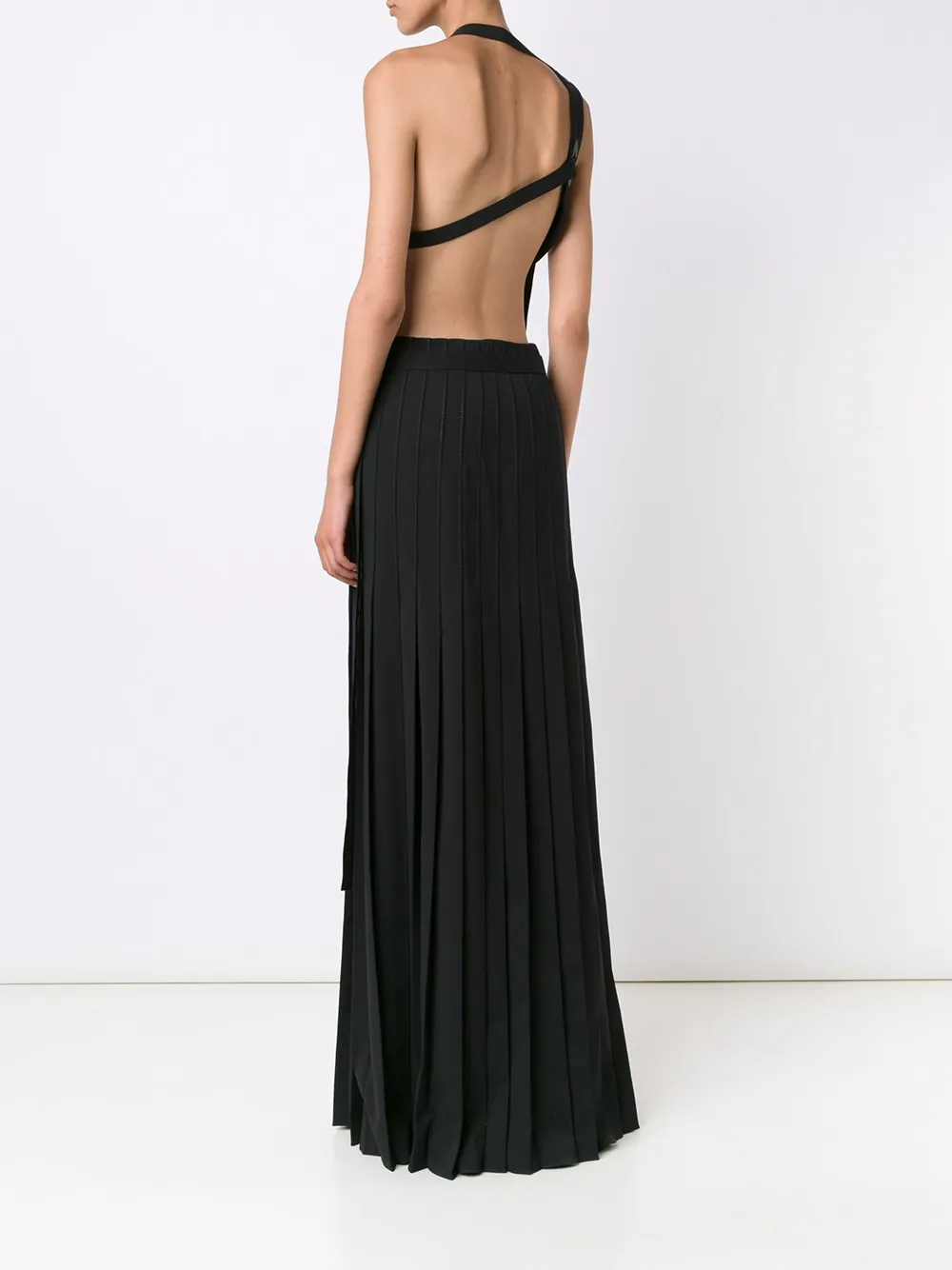 Черное длинное платье с плиссировкой из микса натуральной шерсти от Vera Wang, лямка через шею, нагрудник на шее, плиссированная юбка, открытая спина