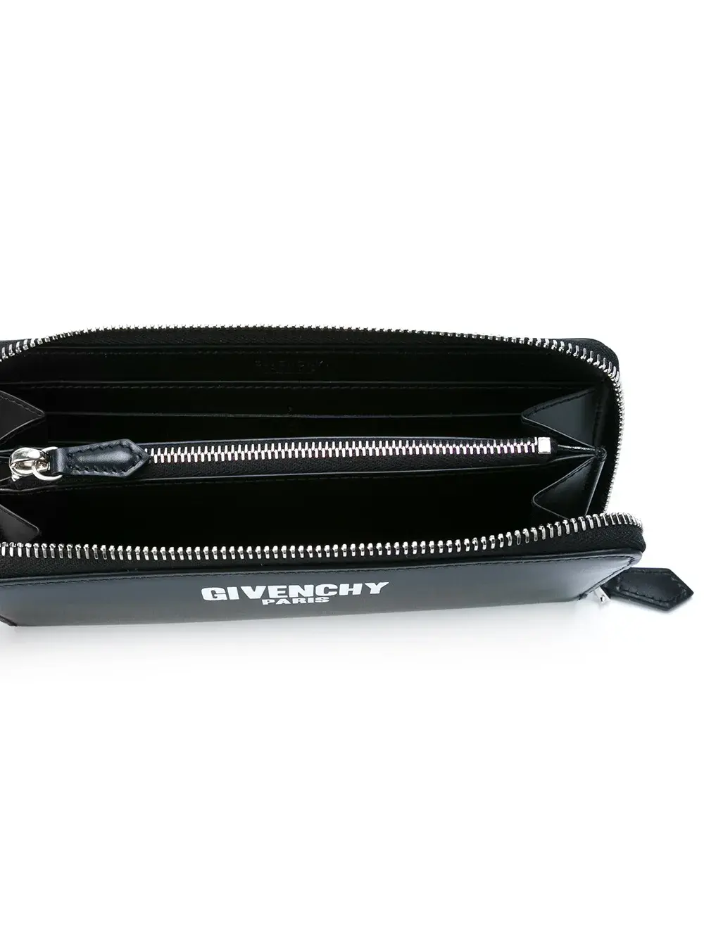 Черный с белым кожаный кошелек с логотипом от Givenchy(Живанши), принт с логотипом спереди, круговая молния, внутренний отдел на молнии, несколько внутренних отделений для карточек, отделение для купюр