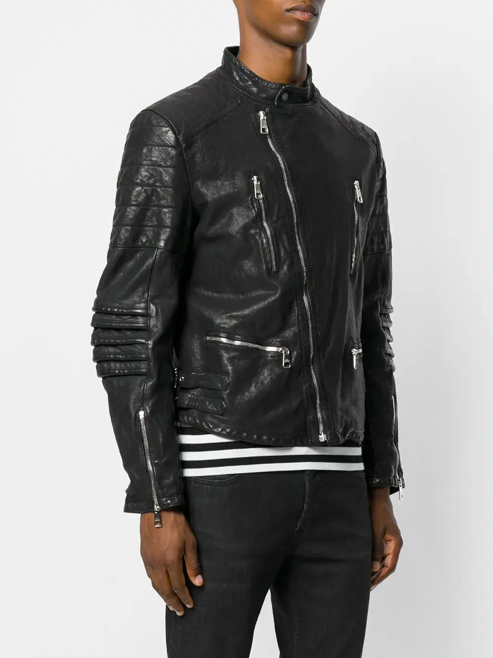 Черная куртка из кожи буйвола на молнии от Neil Barrett, воротник-стойка, ребристые детали, асимметричный фасон, манжеты с молнией, застежка на молнии спереди, молнии сбоку