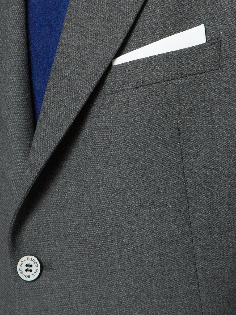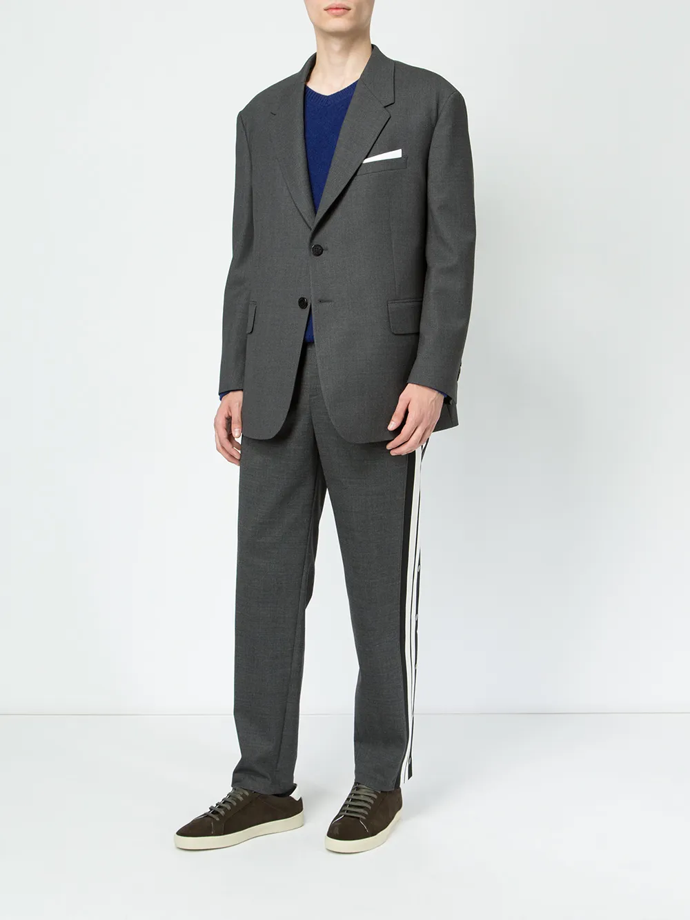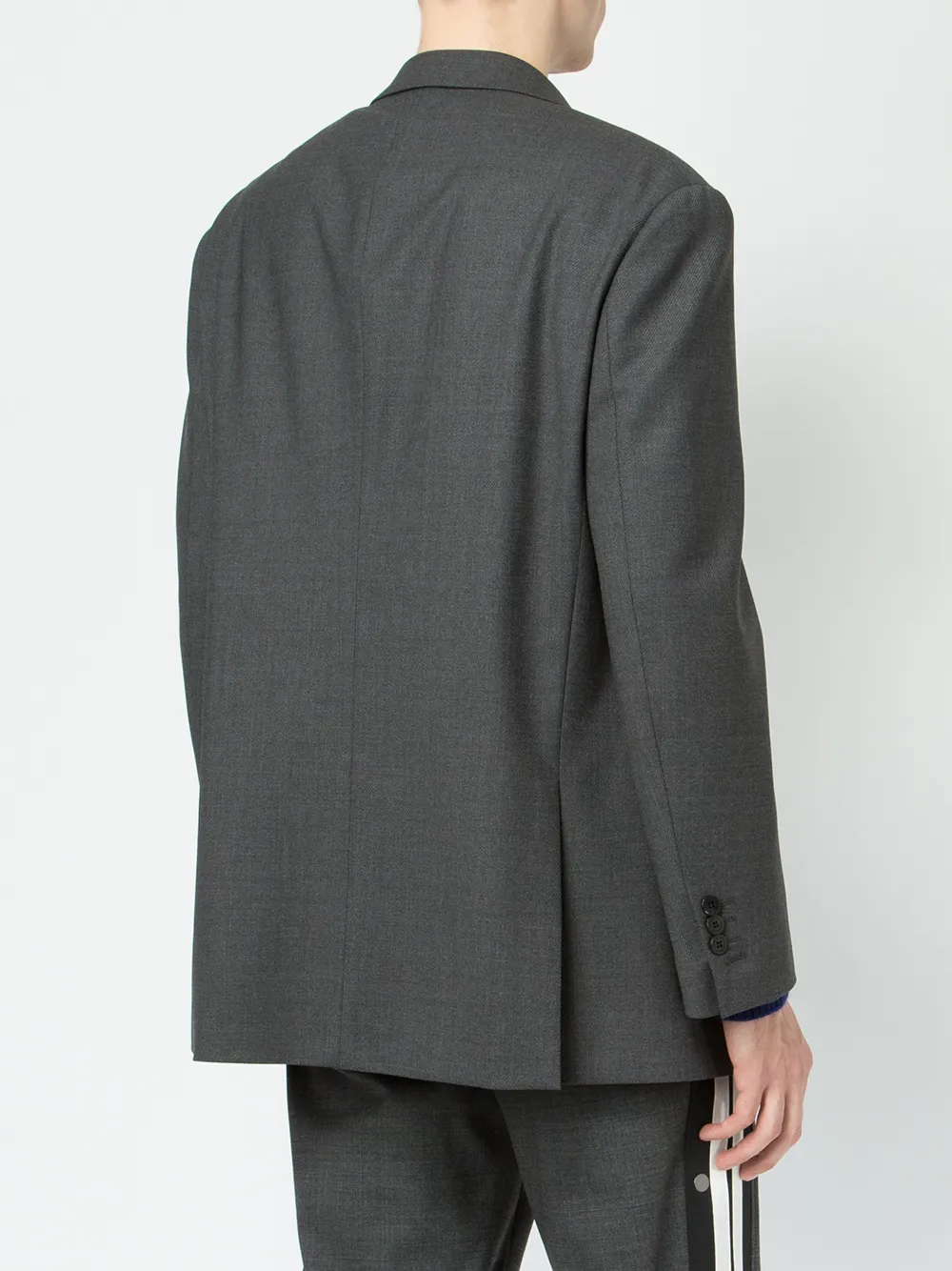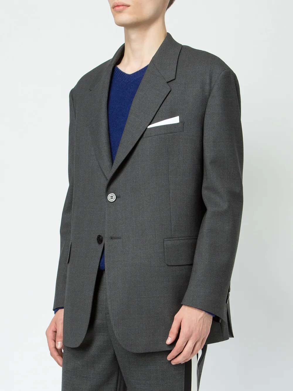 Серый шерстяной классический блейзер от Neil Barrett, заостренные лацканы, карманы с клапанами сбоку, застежка на пуговицах спереди, нагрудный карман