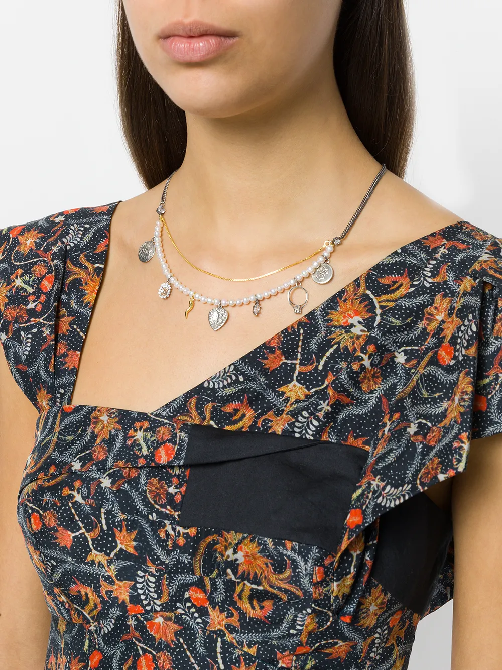 Колье "Silver Heritage" из серебра 925-й пробы с жемчугом от Iosselliani, многоярусная короткая модель, застежка на пружинное кольцо, цепочка из позолоченной латуни спереди, нить из жемчуга с подвесками по центру