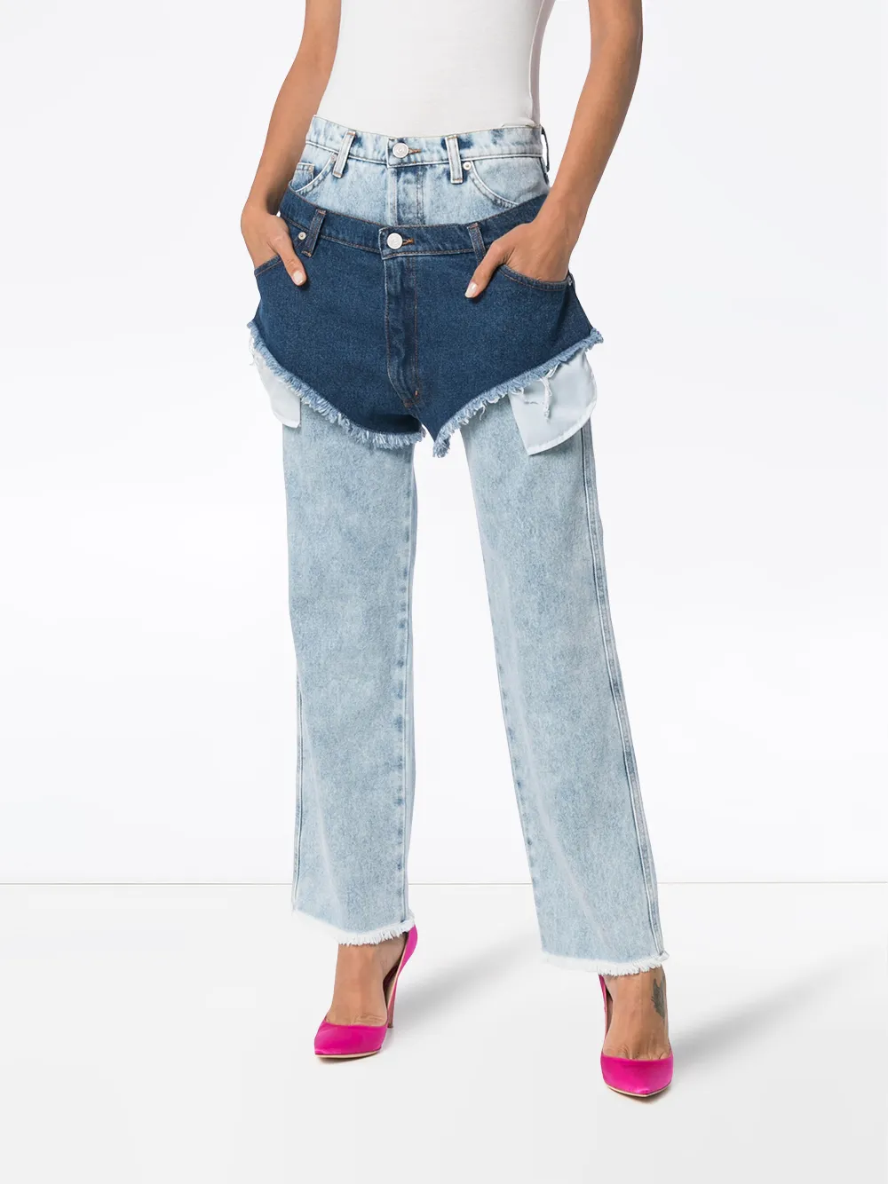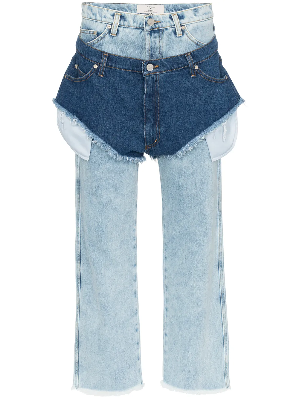 Голубые хлопковые джинсы с высокой талией и с темно-синими шортами от Natasha Zinko.