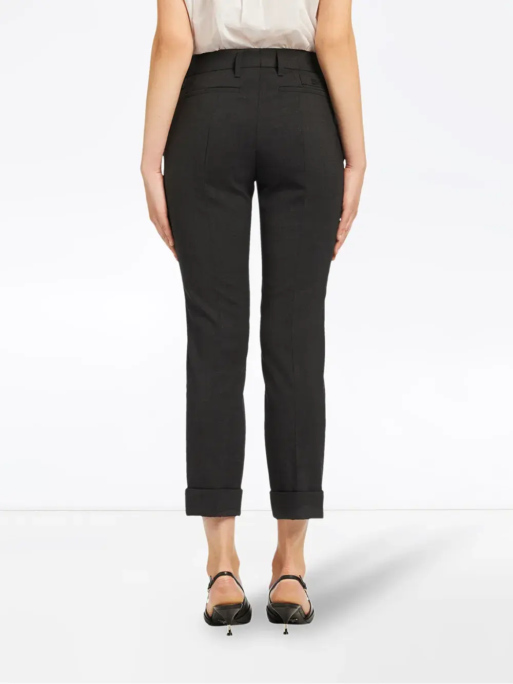 Эластичные брюки "natté" от Prada (Прада), пояс с петлями для ремня, боковые карманы, задние карманы с листочкой и подвернутый подол