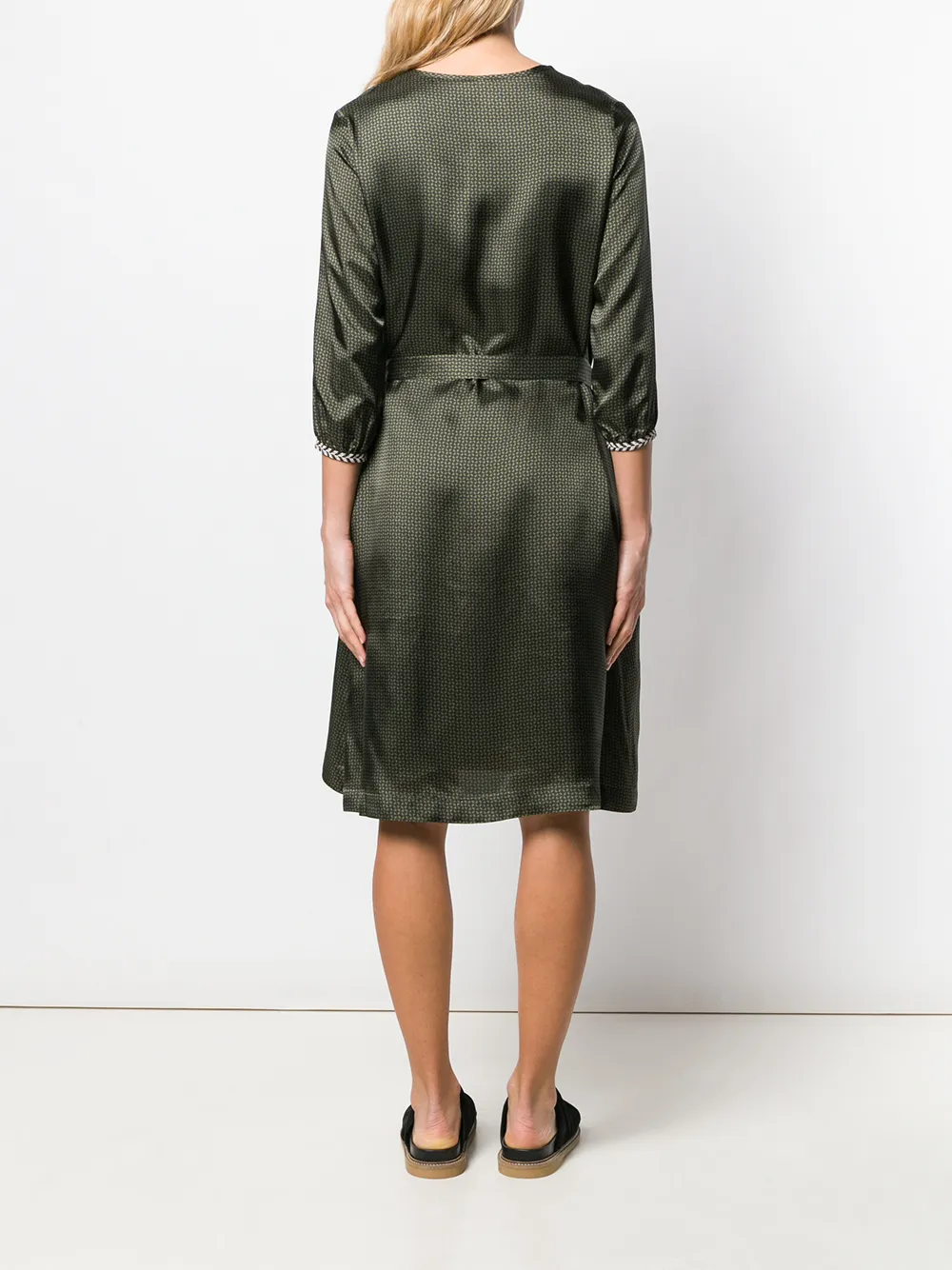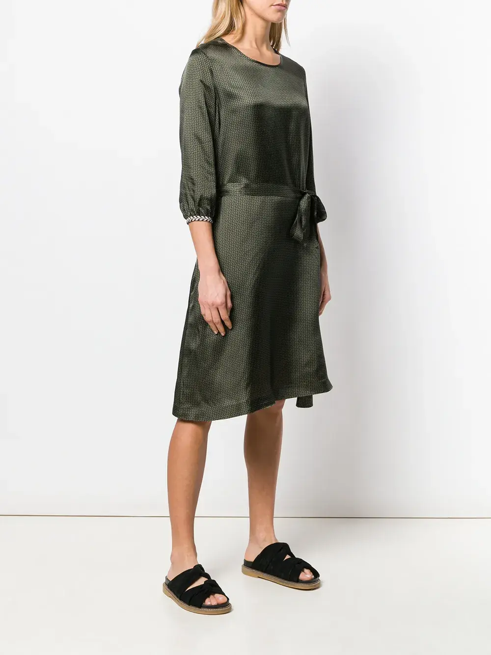 Платье трапеция с принтом от Bellerose, круглый вырез, рукава три четверти, длина по колено, ремень на талии и геометрический узор