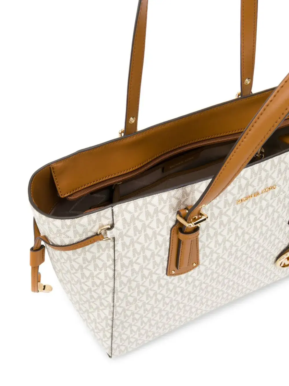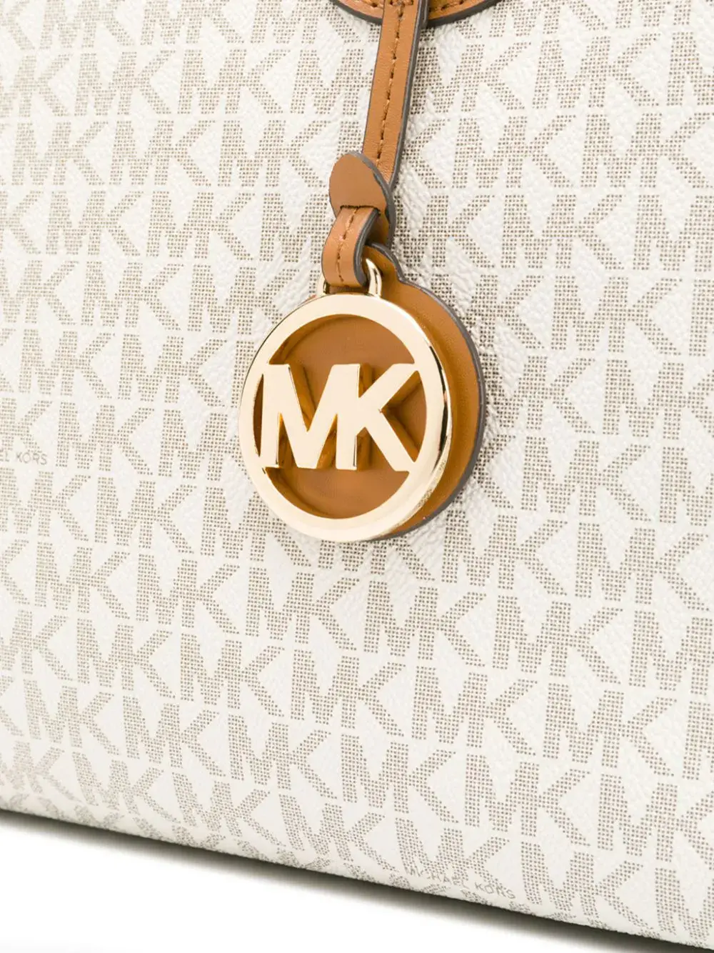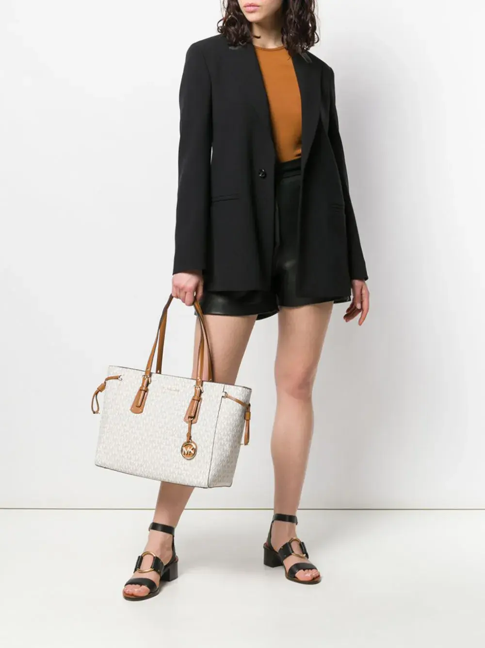 Сумка-тоут Voyager от Michael Michael Kors (Майкл Майкл Корс), верхние ручки, пряжка с логотипом спереди, подвеска с выгравированным логотипом, прошитые панели, застежка на молнии сверху, главный внутренний отдел и внутренний прорезной карман, цвет белый