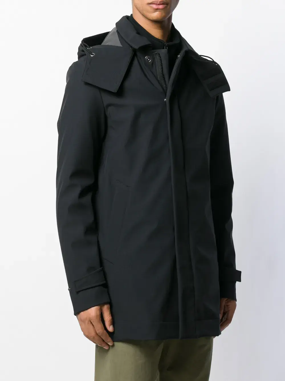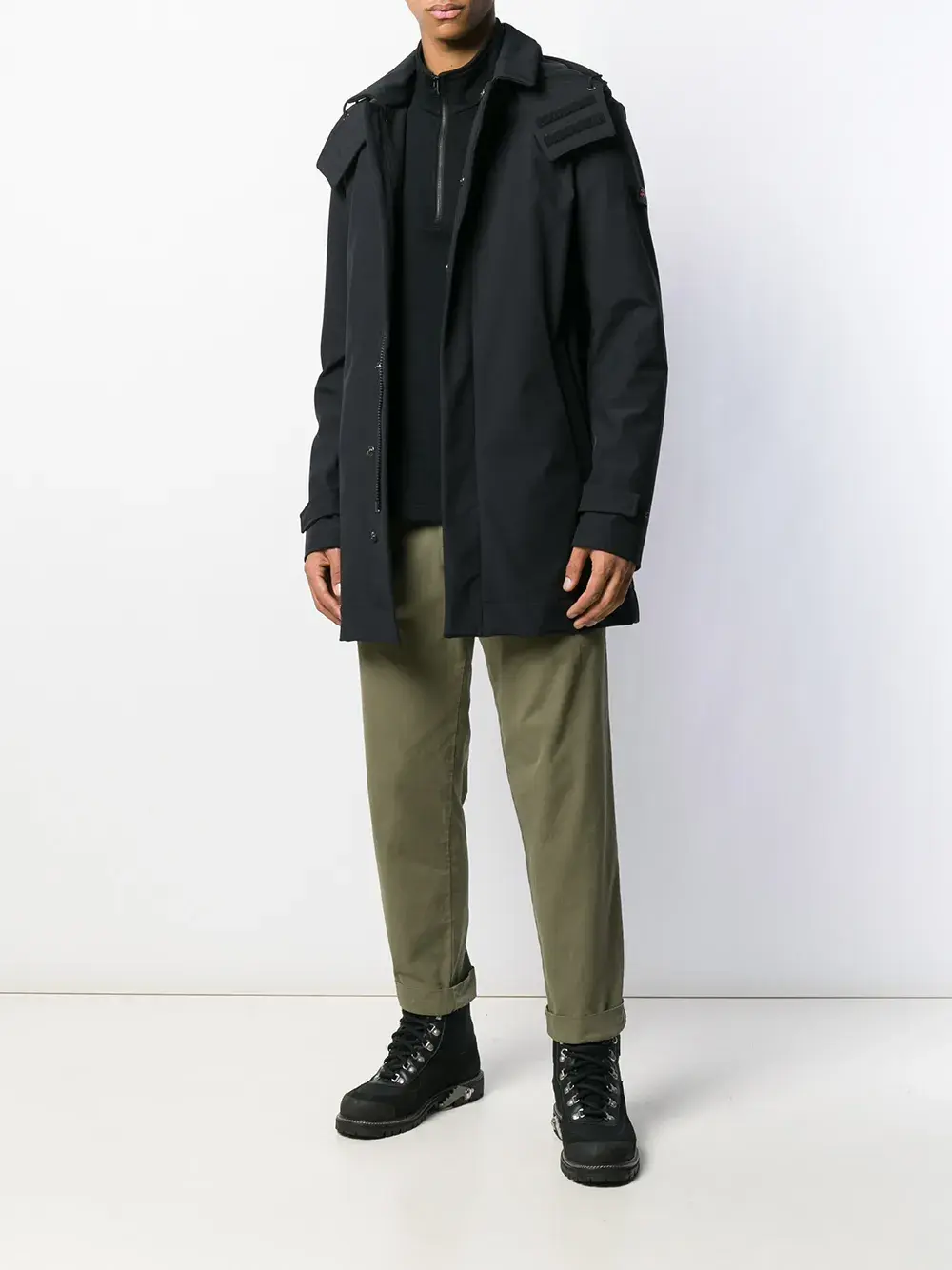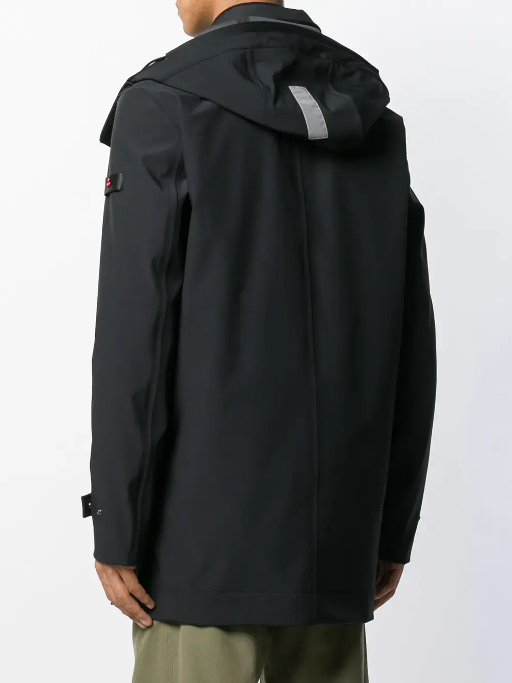 Тренч Field от Peuterey, капюшон, потайная застежка, длинные рукава, боковые карманы и короткая длина, цвет черный