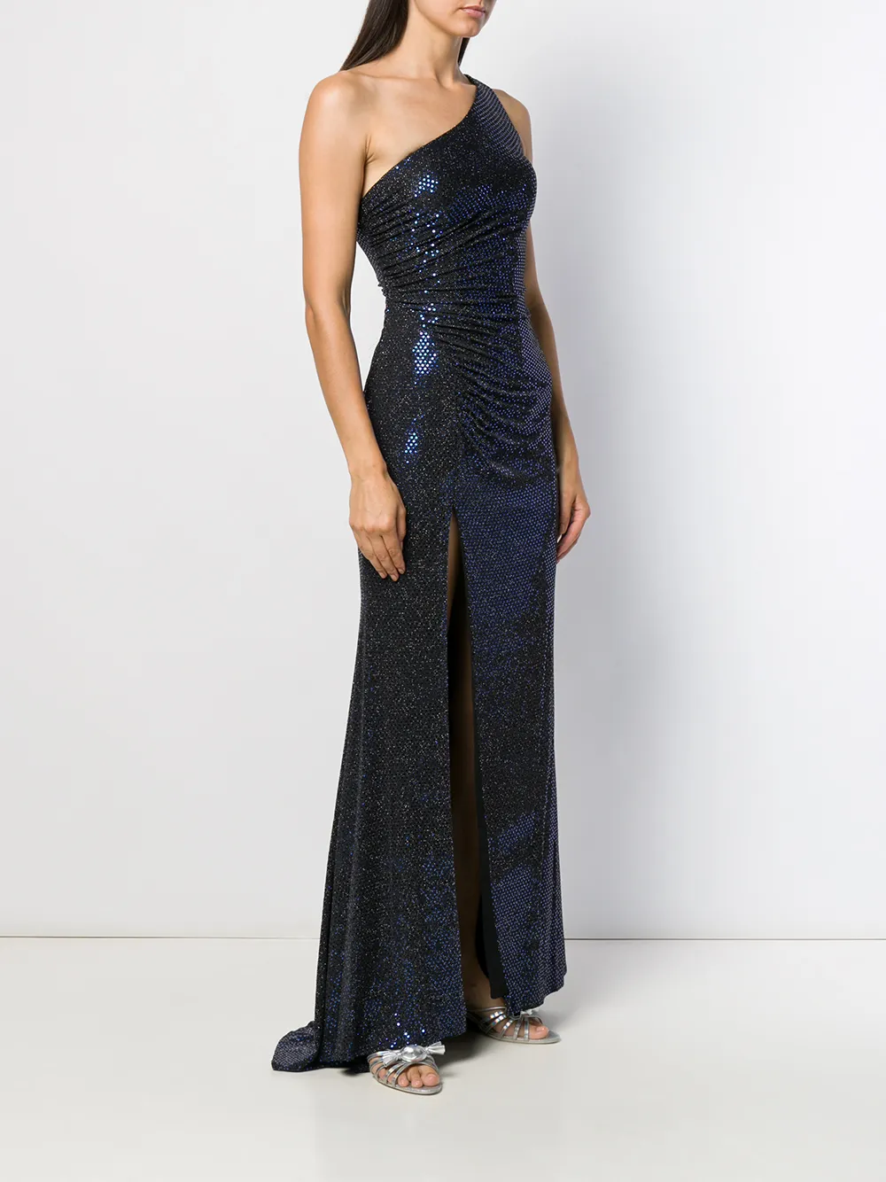 Длинное платье на одно плечо от Blanca, асимметричная горловина, модель на одном плече, открытая спина, детали с рюшами и боковой разрез