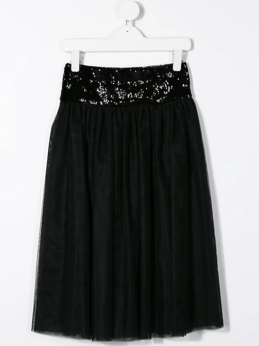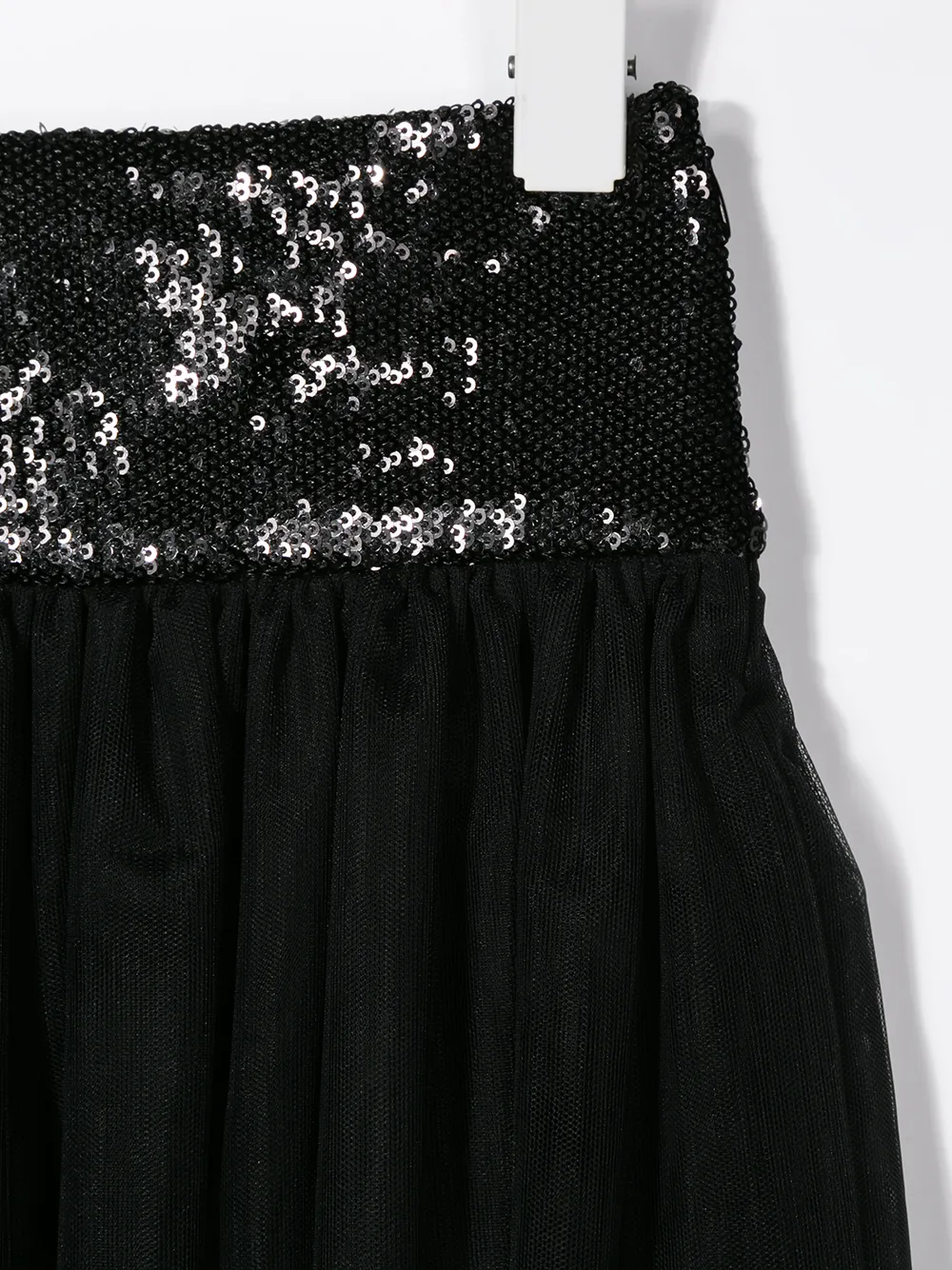 Юбка с пайетками от Balmain Kids, деталь из тюля, потайная застежка на молнии и средней длины, цвет черный