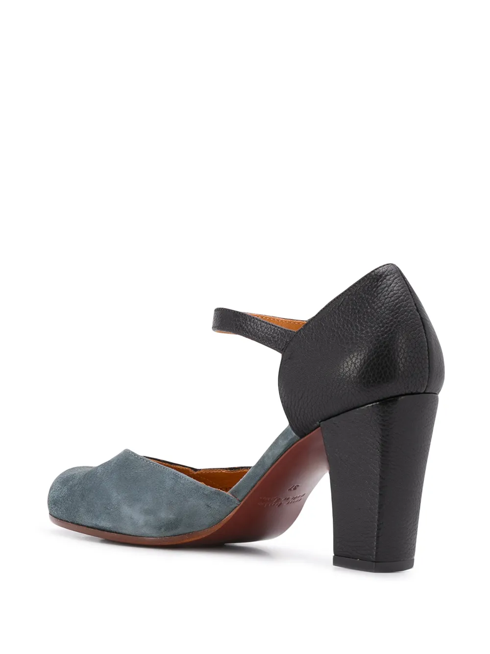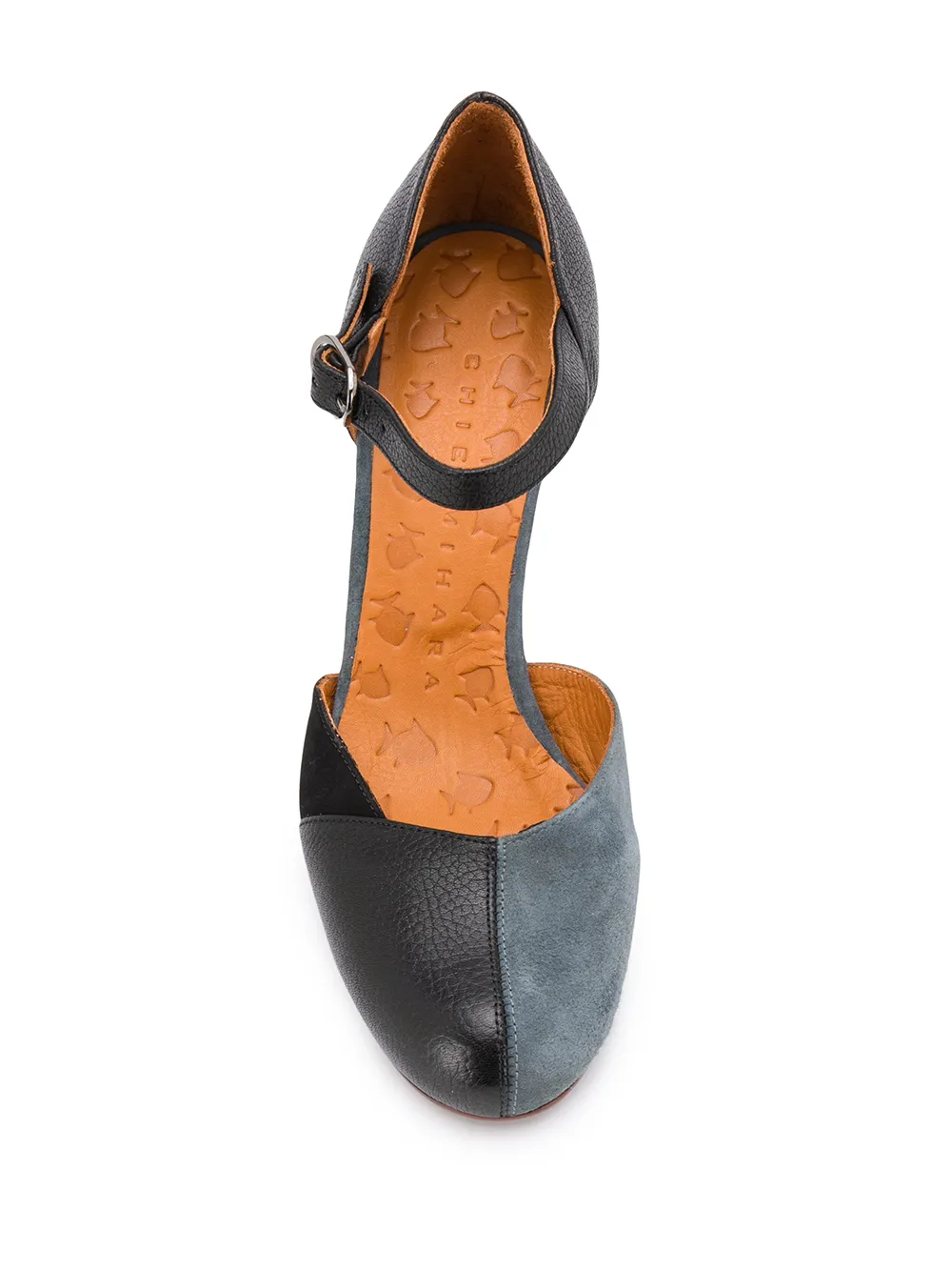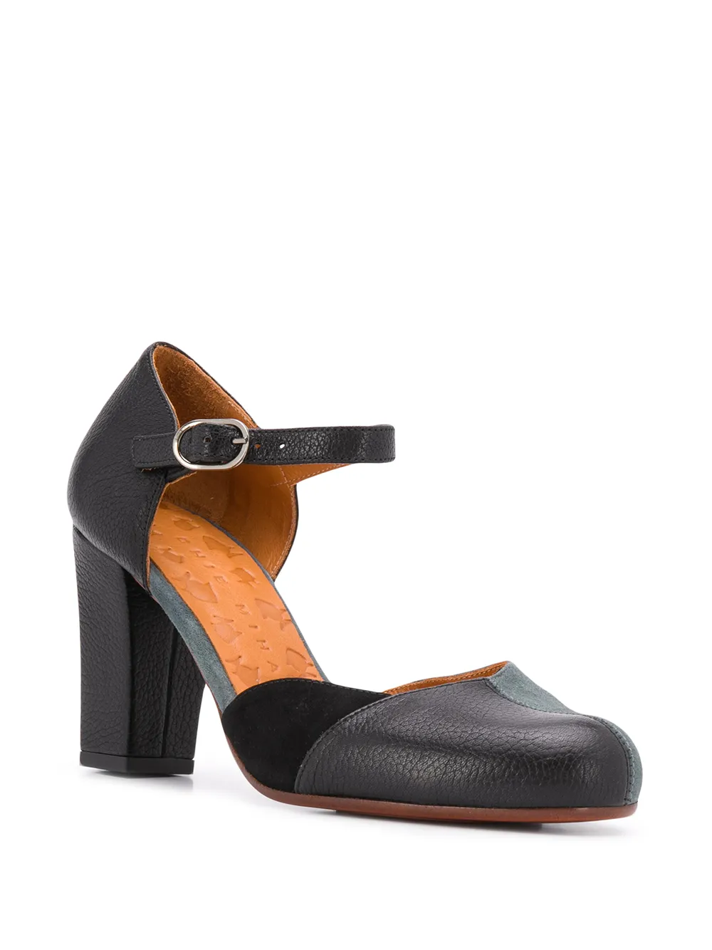 Туфли-лодочки с контрастными вставками от Chie Mihara, закругленный носок, боковая застежка на пряжке, массивный каблук средней высоты, контрастные панели и фирменная стелька