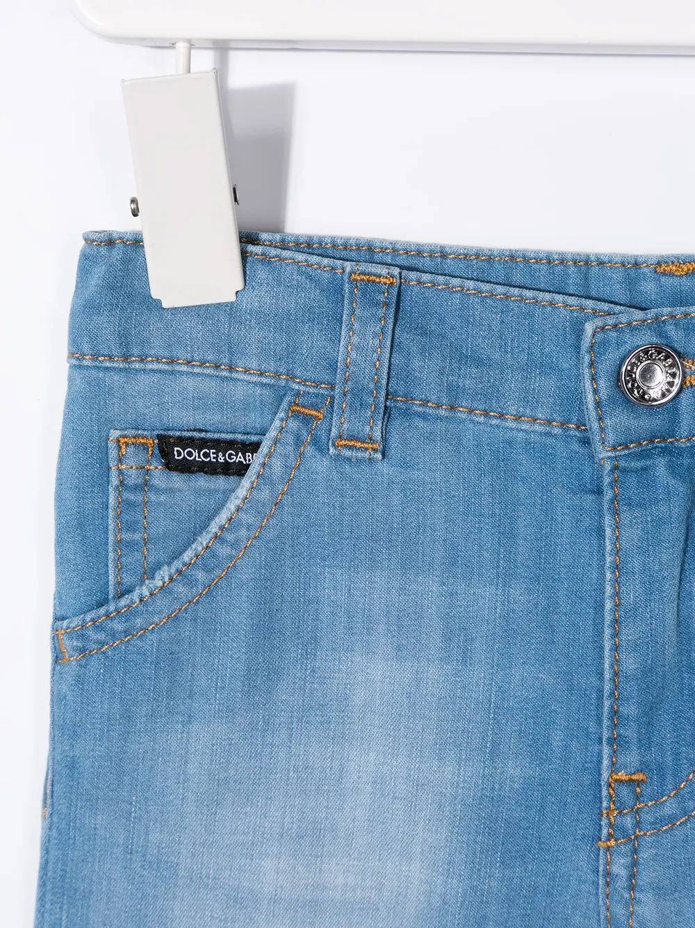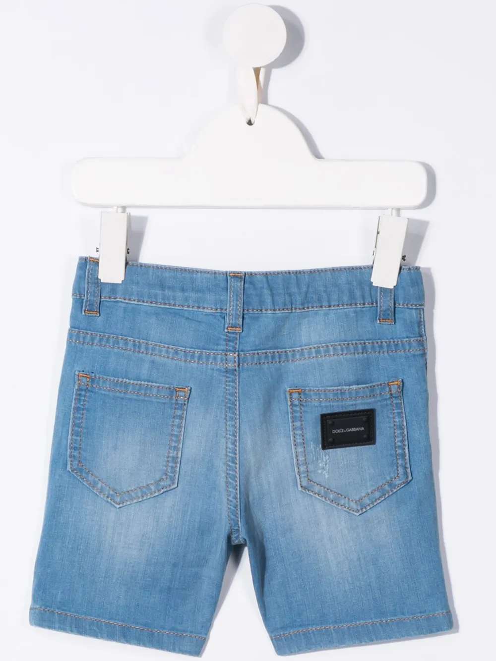 Джинсовые шорты с логотипом от Dolce & Gabbana Kids, эффект "варенки", пояс с петлями для ремня, ширинка на молнии с пуговицей, классическая пятикарманная модель, бляшка с логотипом сзади и короткая длина