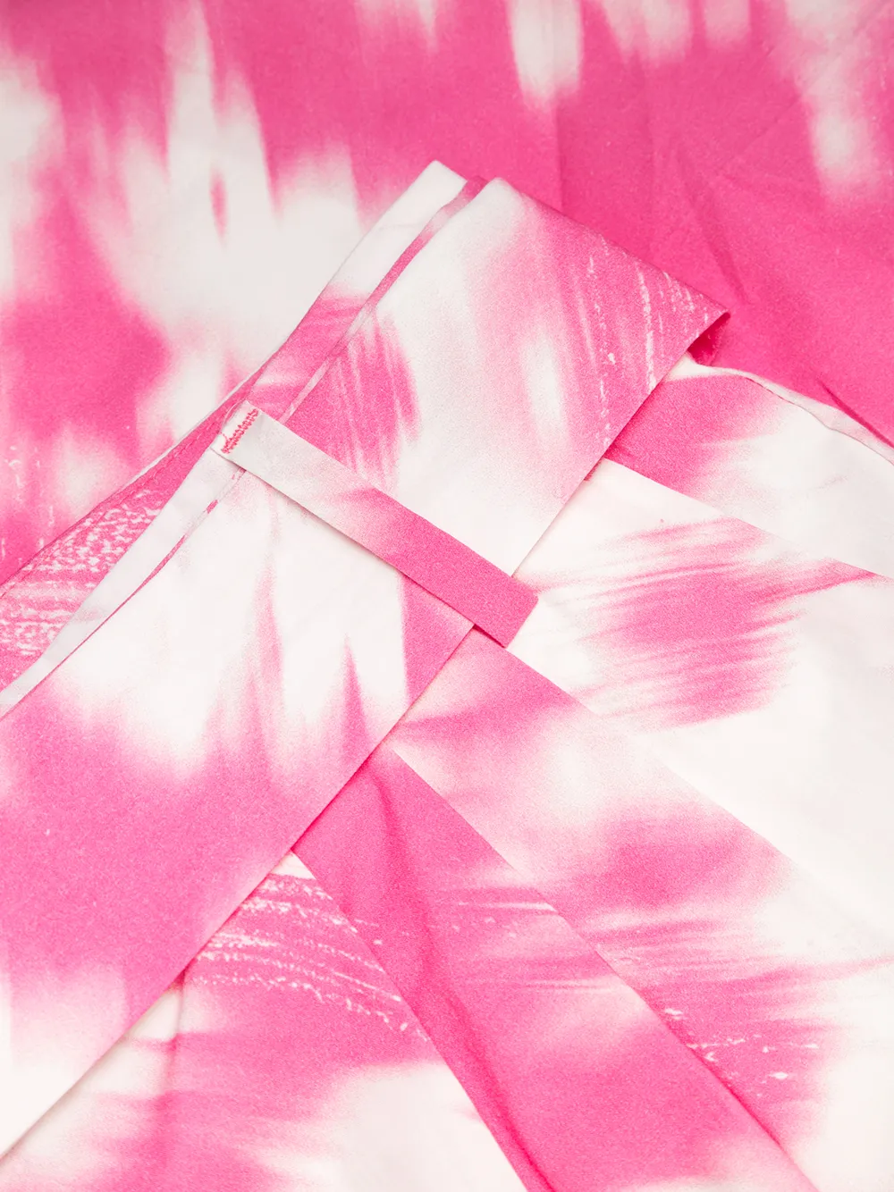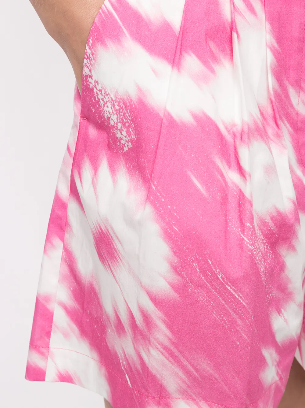 Живописный принт, плиссировка, завышенная талия, ремень на талии, потайная застежка спереди, два прорезных кармана по бокам и два кармана с листочкой сзади, цвет розовый