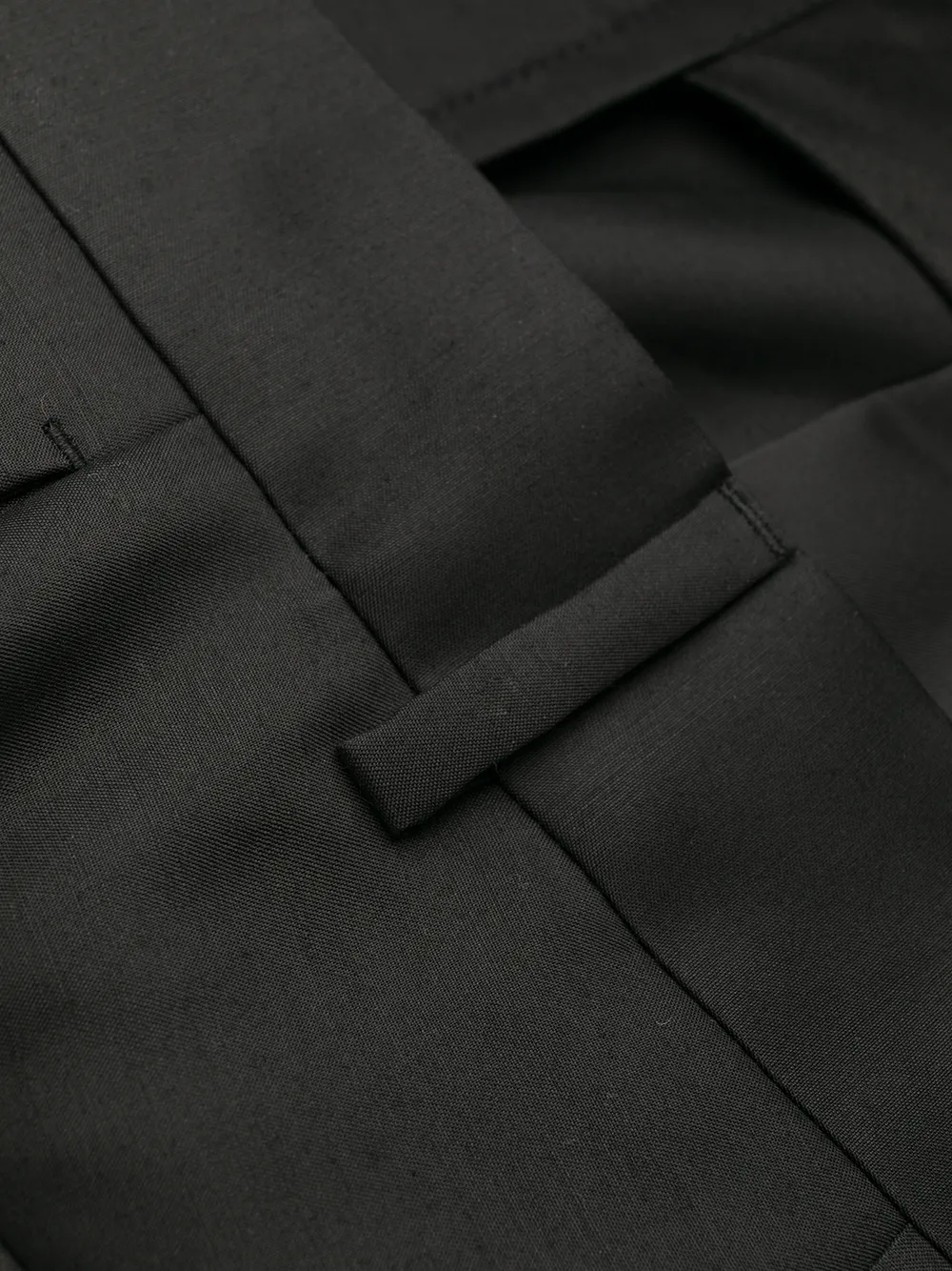 Средняя посадка, петли для ремня, потайная застежка спереди, два прорезных кармана по бокам, два кармана на пуговице сзади и узкий крой, цвет черный