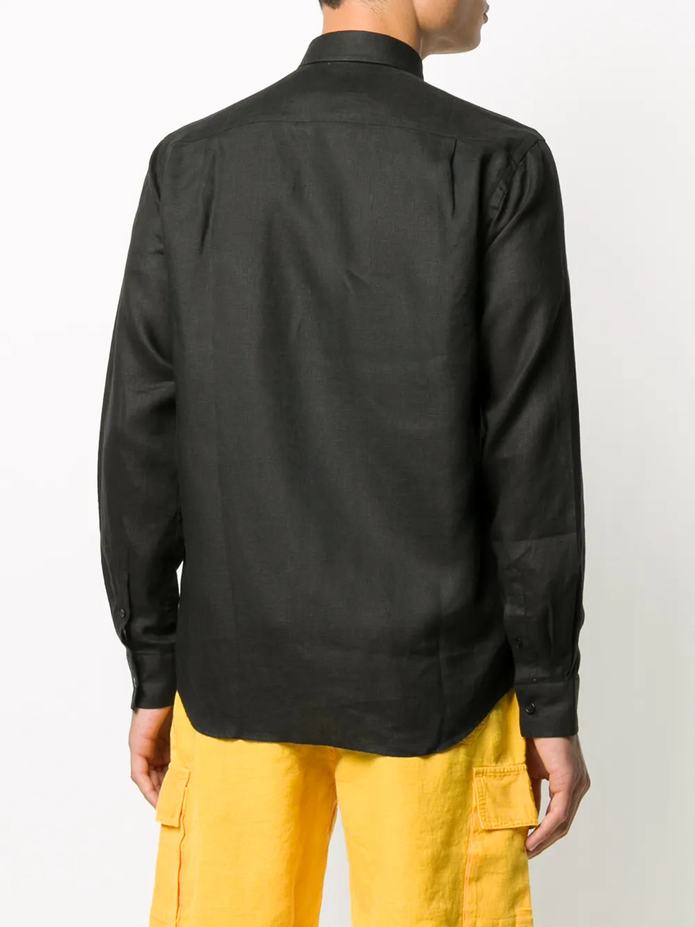 Нагрудный накладной карман, классический воротник, застежка на пуговицах спереди, длинные рукава, манжеты на пуговицах и закругленный подол, цвет черный