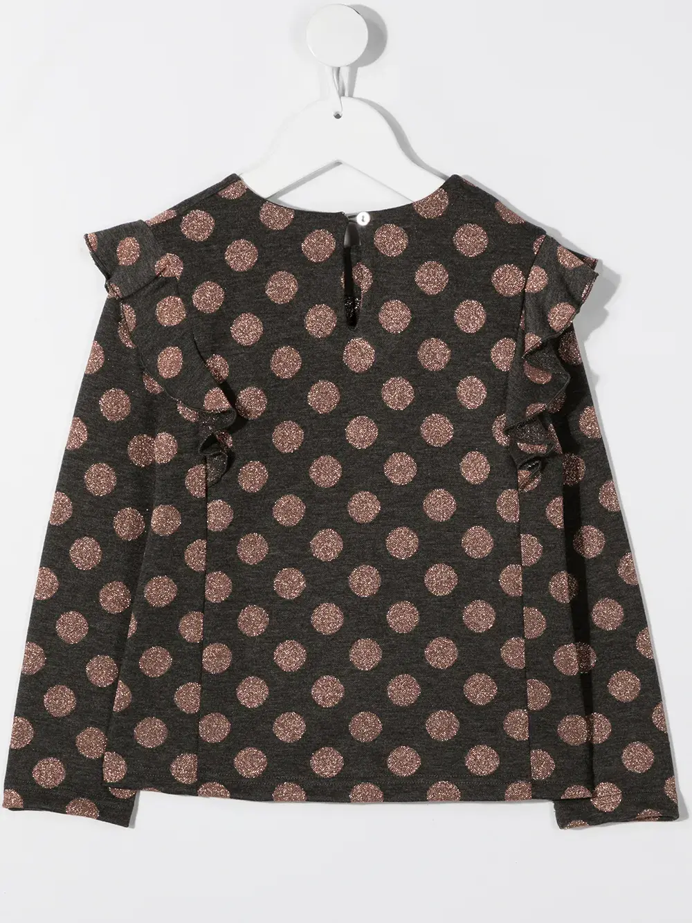 Круглый вырез, застежка на пуговицы сзади, вставки с оборками, длинные рукава и прямой подол, цвет серый