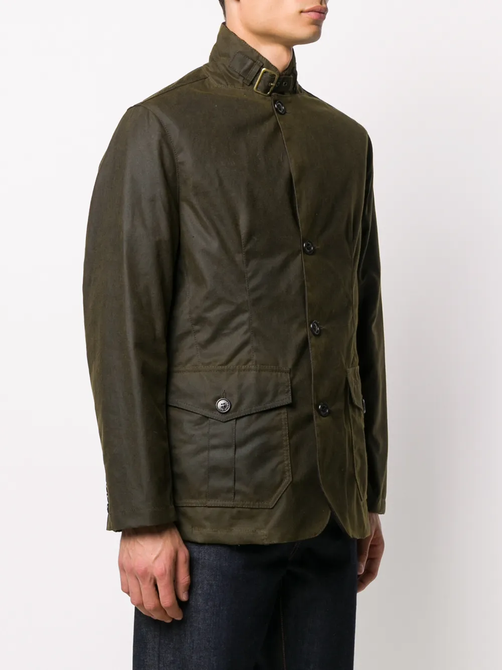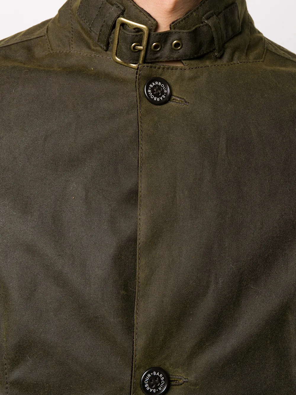 Вощеная ткань, высокий воротник, застежка на пряжке, застежка на пуговицах спереди и длинные рукава