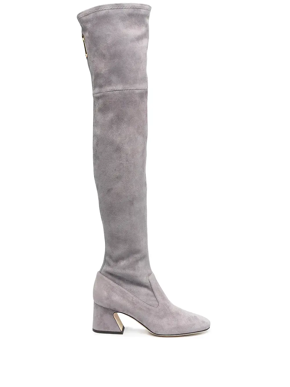 Длина по колено, застежка на молнии сзади, миндалевидный носок и наборный каблук средней высоты, цвет серый