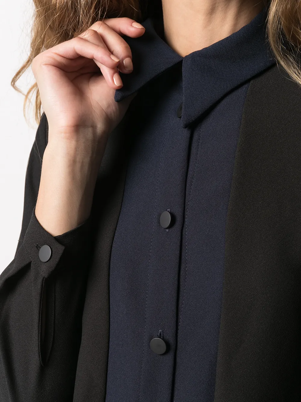 Двухцветная деталь, прямой воротник, застежка на пуговицах спереди, два передних кармана с листочкой, длинные рукава, манжеты на пуговицах и прямой подол