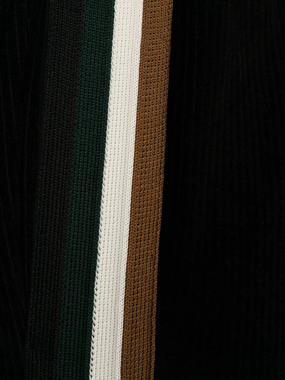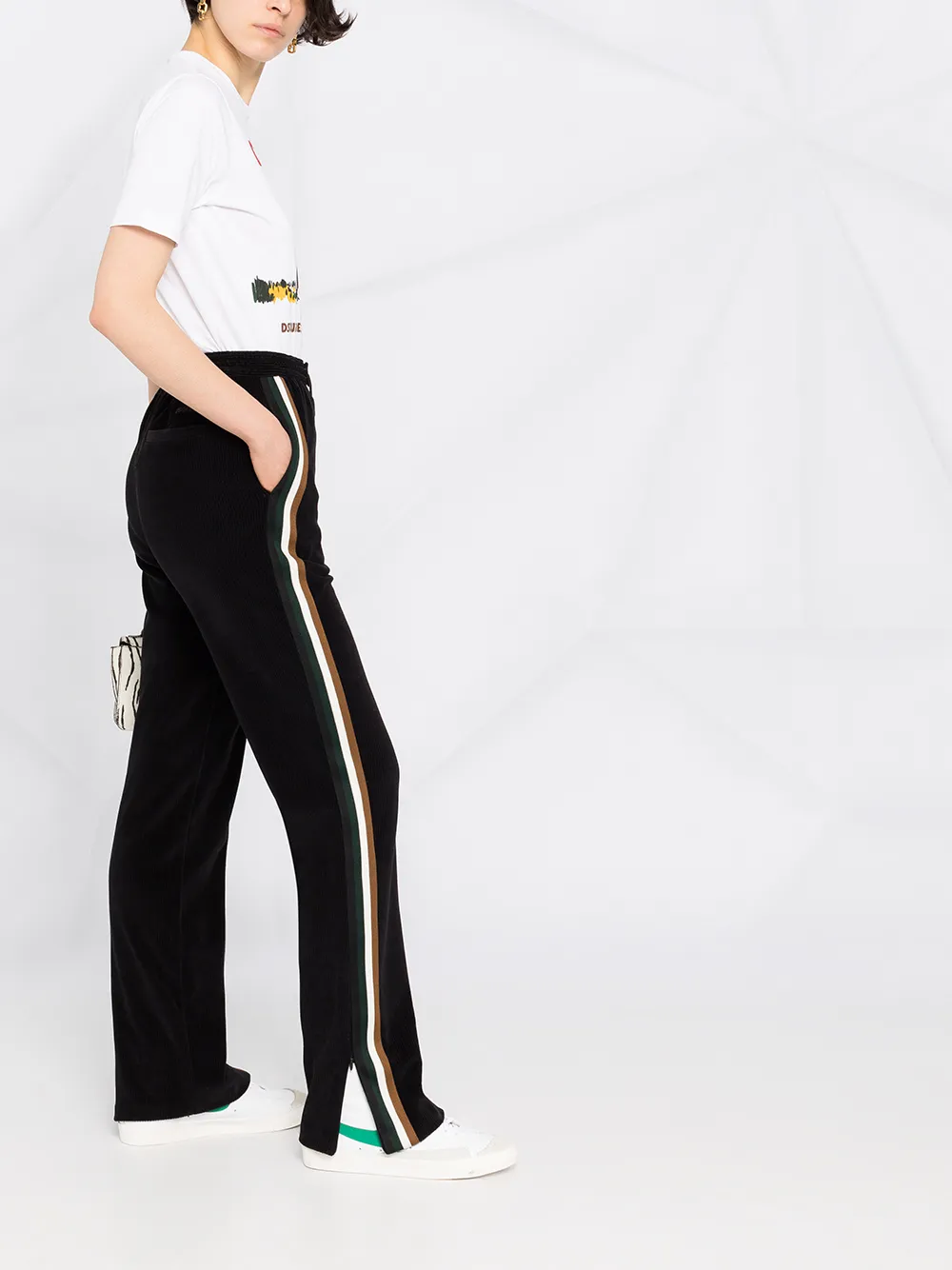 Вельветовый материал, полоска сбоку, эластичный пояс, завязка на шнурке, два прорезных кармана по бокам и задние карманы с листочкой, цвет черный