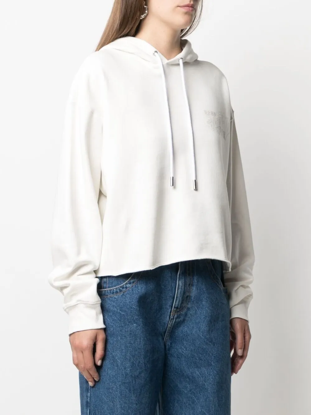 Затягивающийся на шнурок капюшон, приспущенные плечи, длинные рукава, принт с логотипом на груди и графичный принт на спине, цвет белый