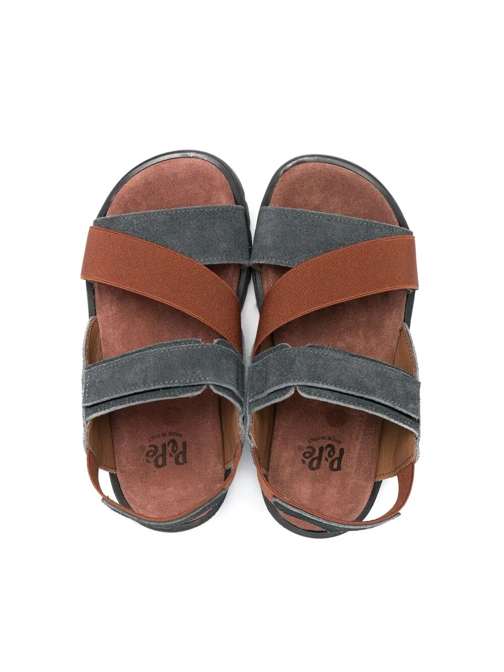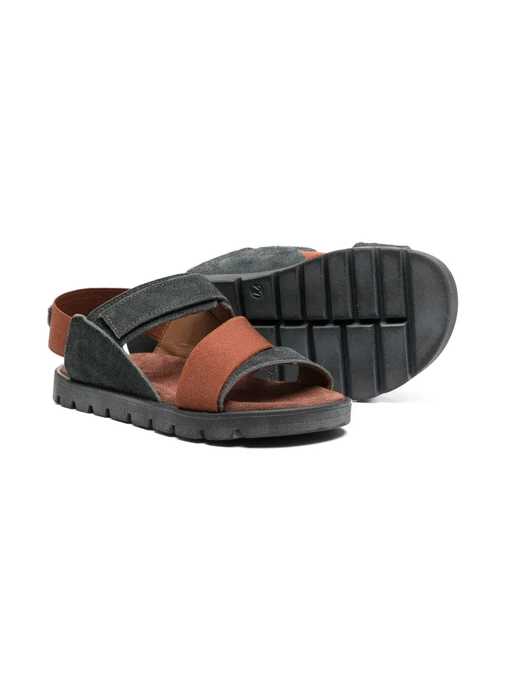Сочетание двух оттенков, стелька с логотипом, открытый носок, эластичные резинки, застежка на липучке спереди и плоская резиновая подошва