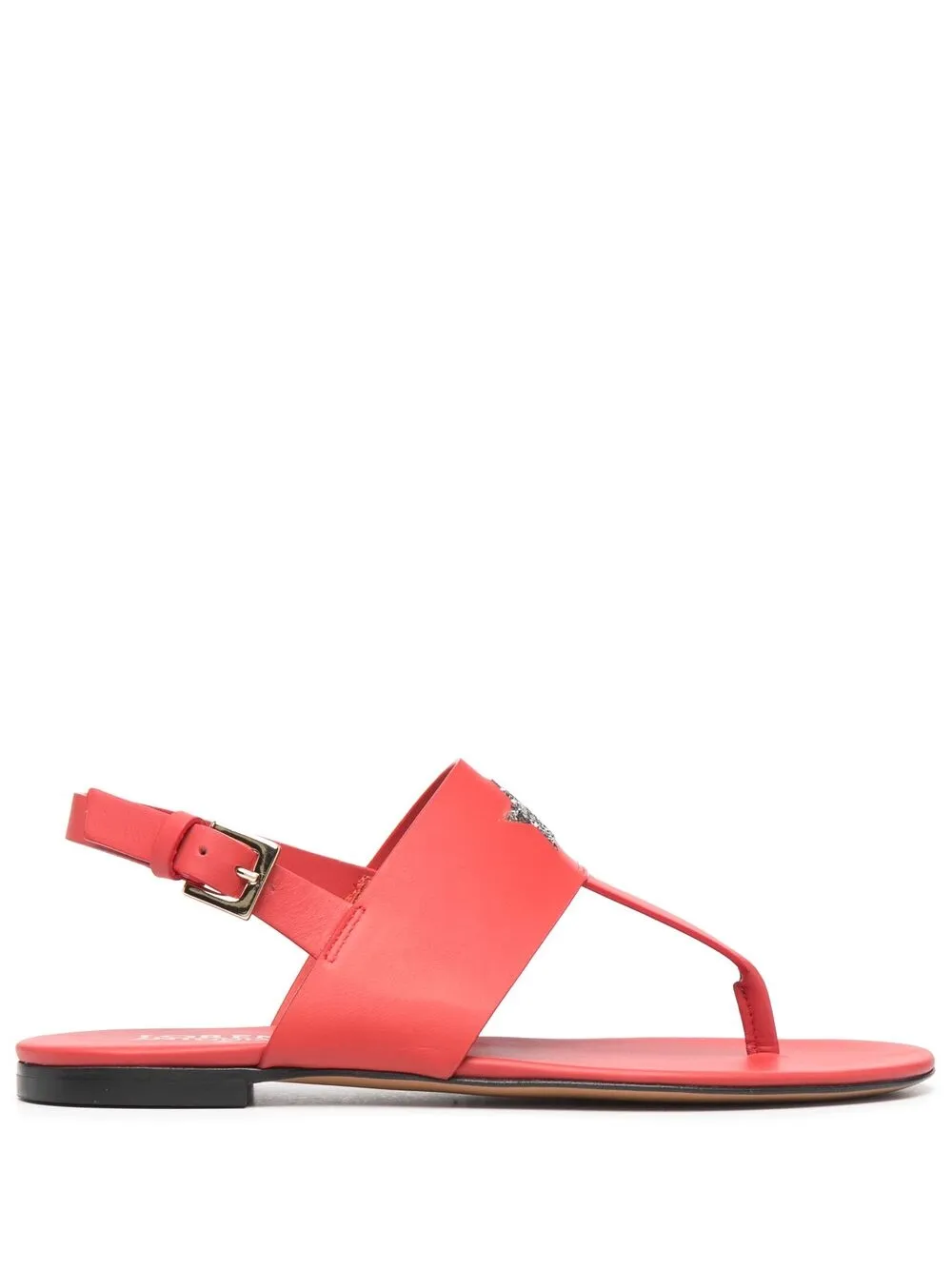 Логотип из заклепок, открытый носок, ремешок на щиколотке с пряжкой и плоская резиновая подошва