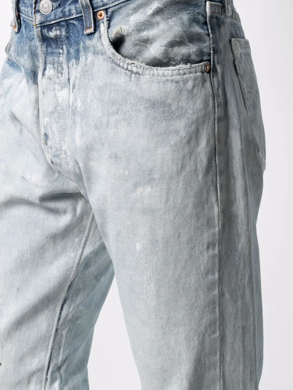 Средняя посадка, прямой крой, эффект потертости, эффект обесцвечивания, петли для ремня, классическая пятикарманная модель и ширинка на пуговицах, цвет синий
