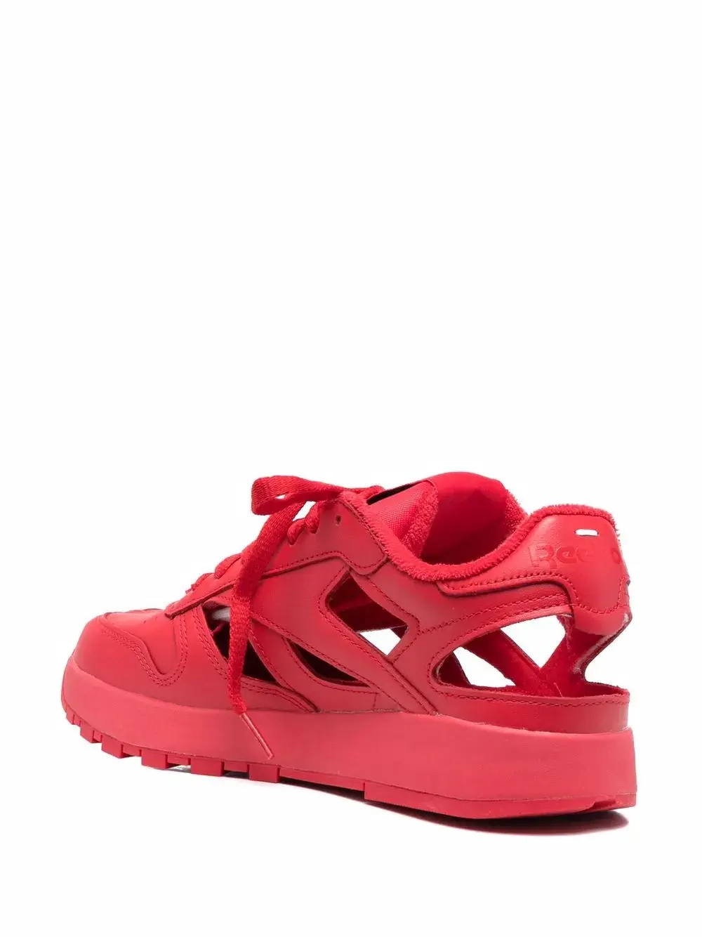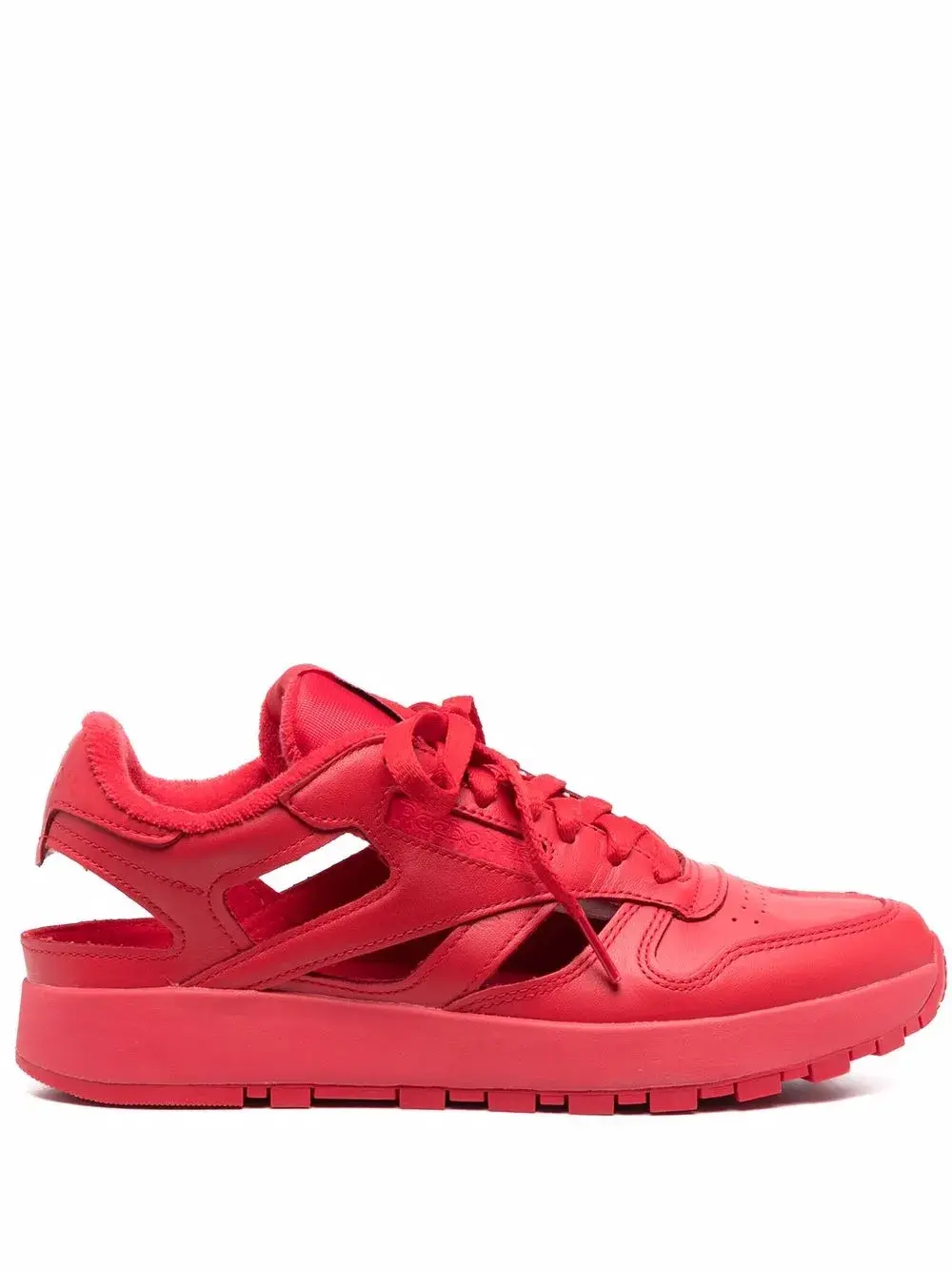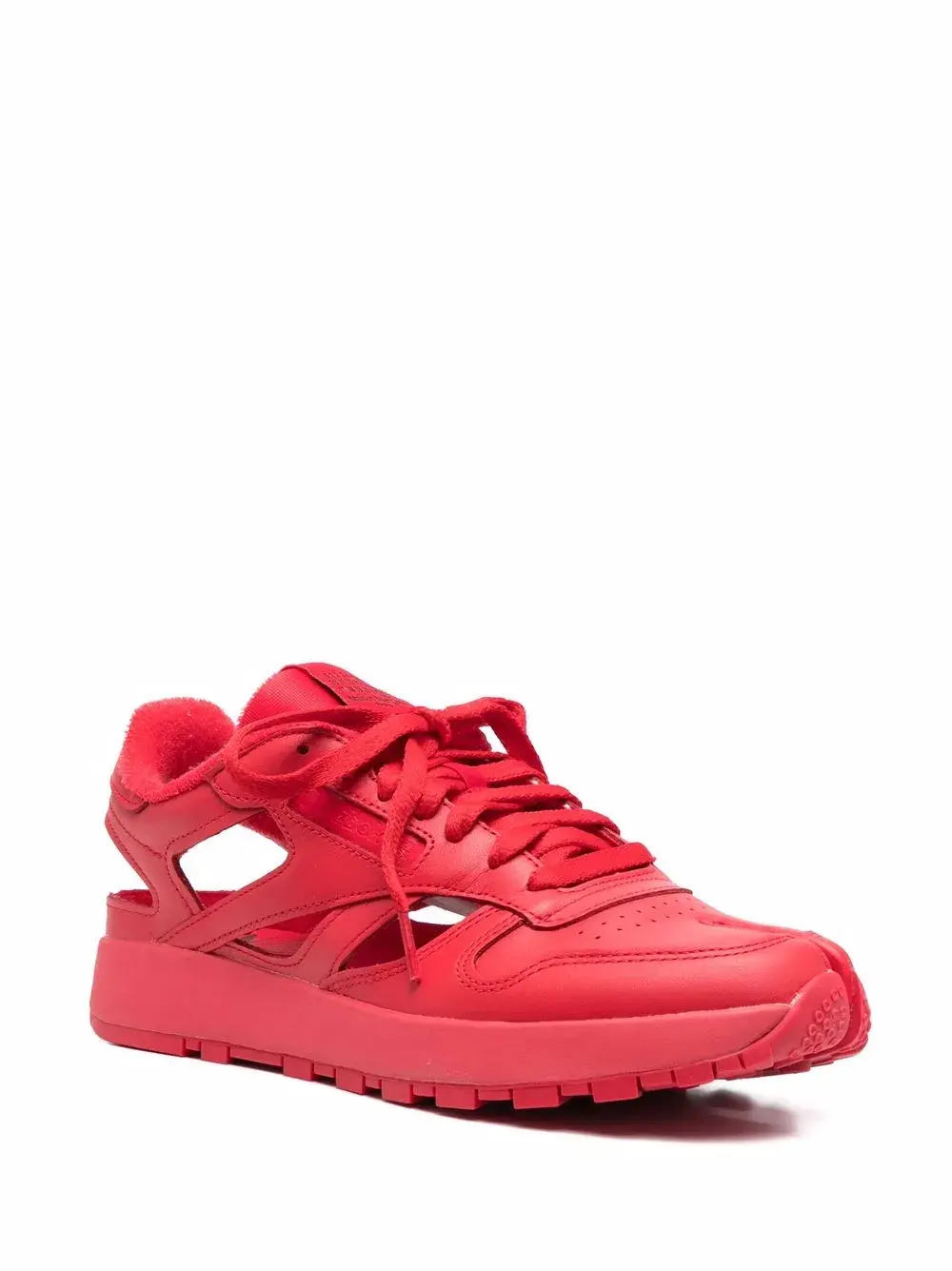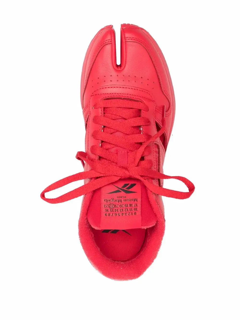 Вырезные детали, нашивка с логотипом на язычке, знаковый раздвоенный носок Tabi, шнуровка спереди, стелька с логотипом и плоская резиновая подошва, цвет красный